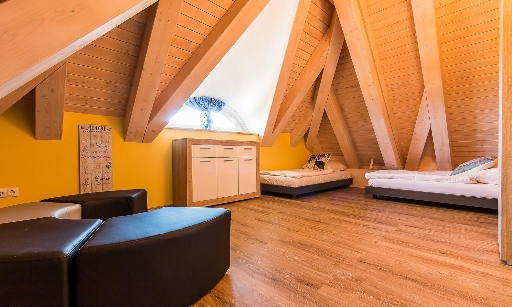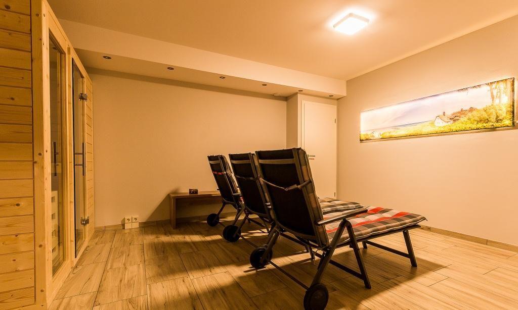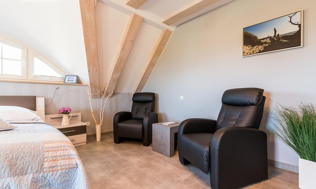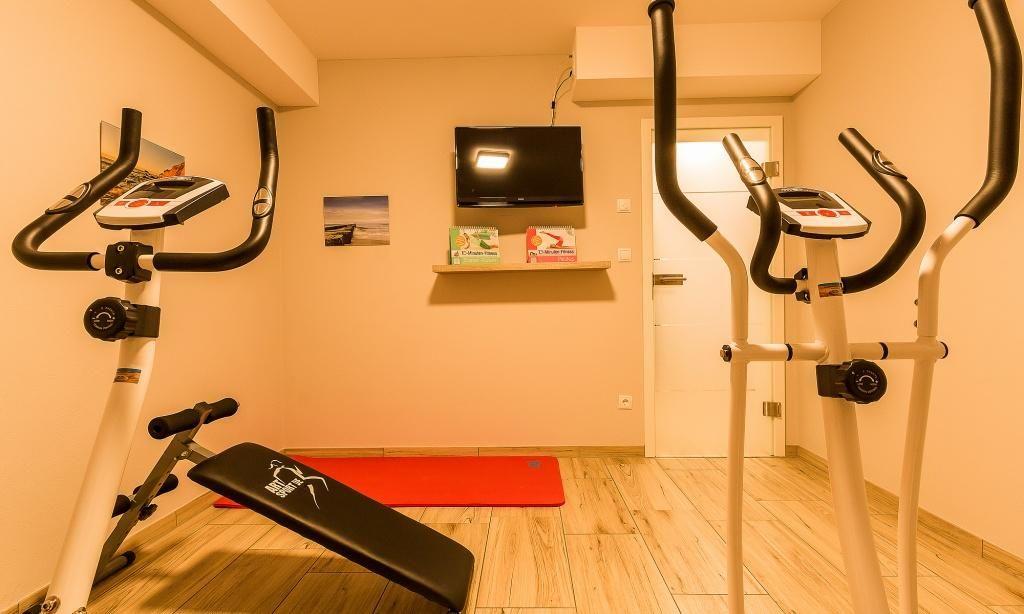 Das Obergeschoss begehst du über die wertige Echtholztreppe. Dort erwartet dich ein großes Schlafzimmer mit Doppelbett, TV-Gerät und angrenzendem Balkon mit Blick auf die Ostsee - Sundown-Garantie inklusive. Ein weiteres Doppelbett-Zimmer verfügt ebenfalls über einen TV-Gerät und wunderschönen Meerblick. Auch das zweite Badezimmer mit Wanne, Dusche und WC findet hier seinen Platz. Beim Baden kannst du den Blick über die Dünen auf die Ostsee genießen. Im großen, imposanten Spitzboden finden sich drei große Einzelbetten und eine kleinen Spielecke. Dieses Dachgeschoss ist ein idealer Rückzugsort für große und kleine Ostsee-Fans. Das Untergeschoss hält eine kleine Wellnessoase mit Sauna, Dusche und Ruhebereich für dich bereit. Wer im Urlaub fit bleiben möchte, kann den angrenzenden Fitnessraum, ausgestattet mit einem Heimtrainer, einem Crosstrainer, einer Fitnessbank und zusätzlichem TV-Gerät nutzen.