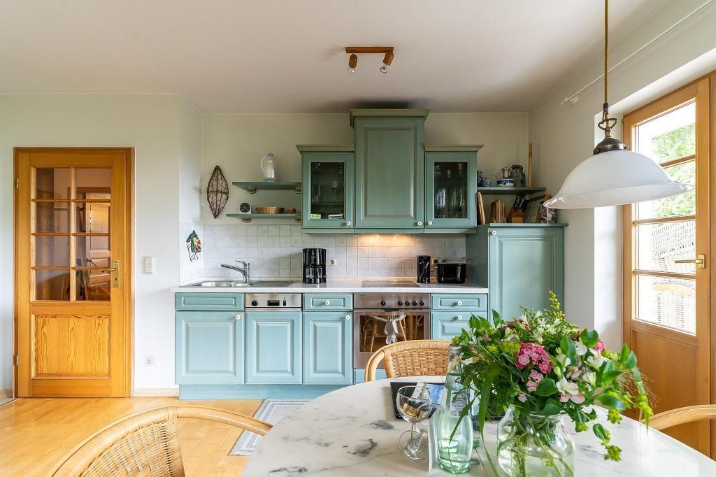 Die Küche im charmanten Landhaus-Stil ist voll ausgestattet und bietet dir alles, was du zum Kochen brauchst. Hier kannst du entspannt deine Mahlzeiten zubereiten und den Urlaub ganz nach deinem Geschmack genießen.