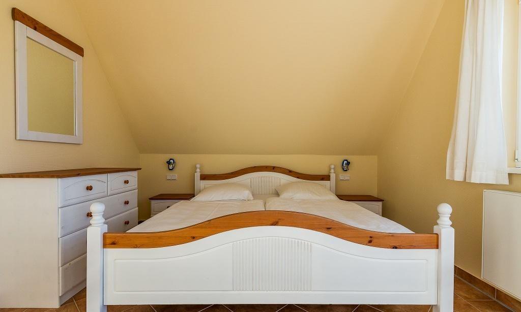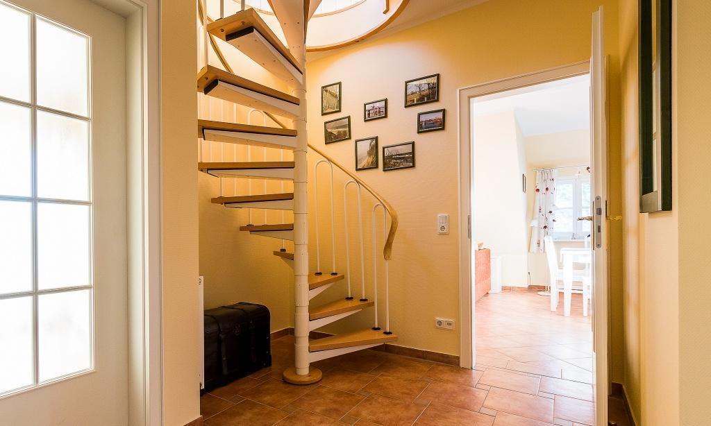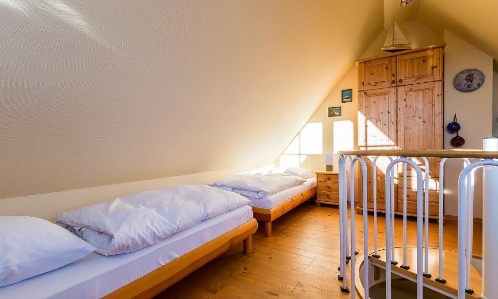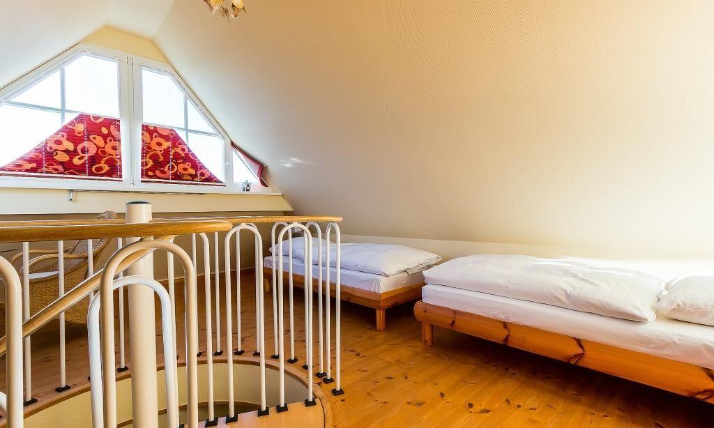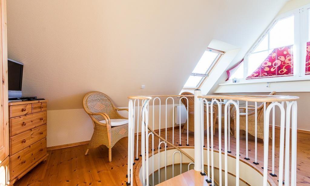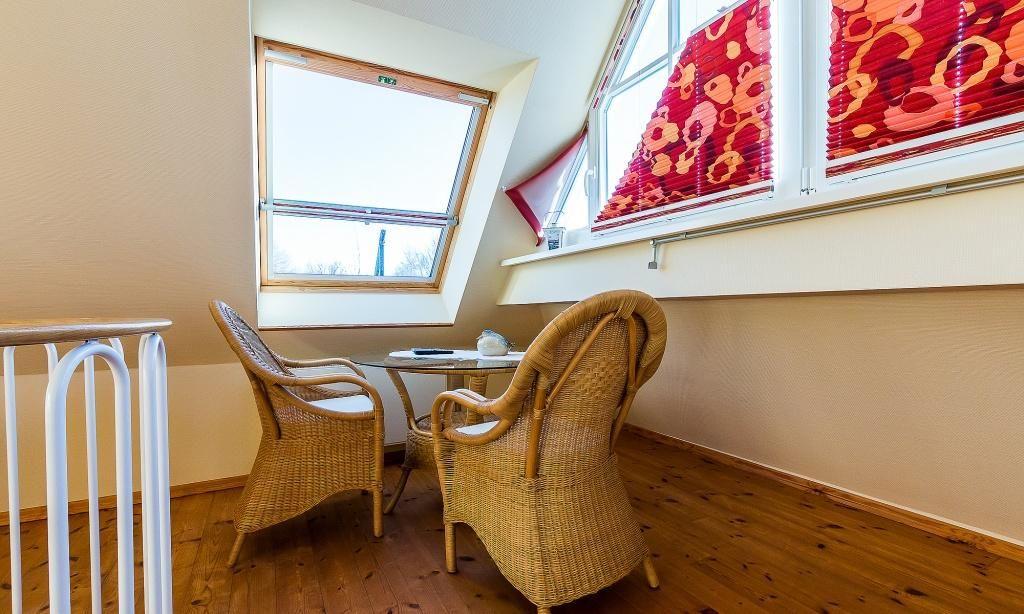 Die Maisonnette-Wohnung befindet sich im Obergeschoss. Hier erwartet dich der Wohnraum, ausgestattet mit einer gemütlichen Sitzecke. Der Süd-Balkon ist direkt vom Wohnbereich aus begehbar. Die gut ausgestattete Küchenzeile und der große Esstisch sind unmittelbar integriert und schaffen einen offenen Wohncharakter. Das Bad verfügt über Dusche/WC und Waschmaschine. Das offene und lichtdurchflutete Dachgeschoss erreichst du über eine Wendeltreppe. Hier befindet sich ein weiterer Schlafbereich mit zwei Einzelbetten und einer kleinen Sitzmöglichkeit.