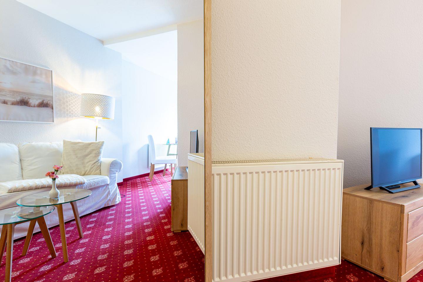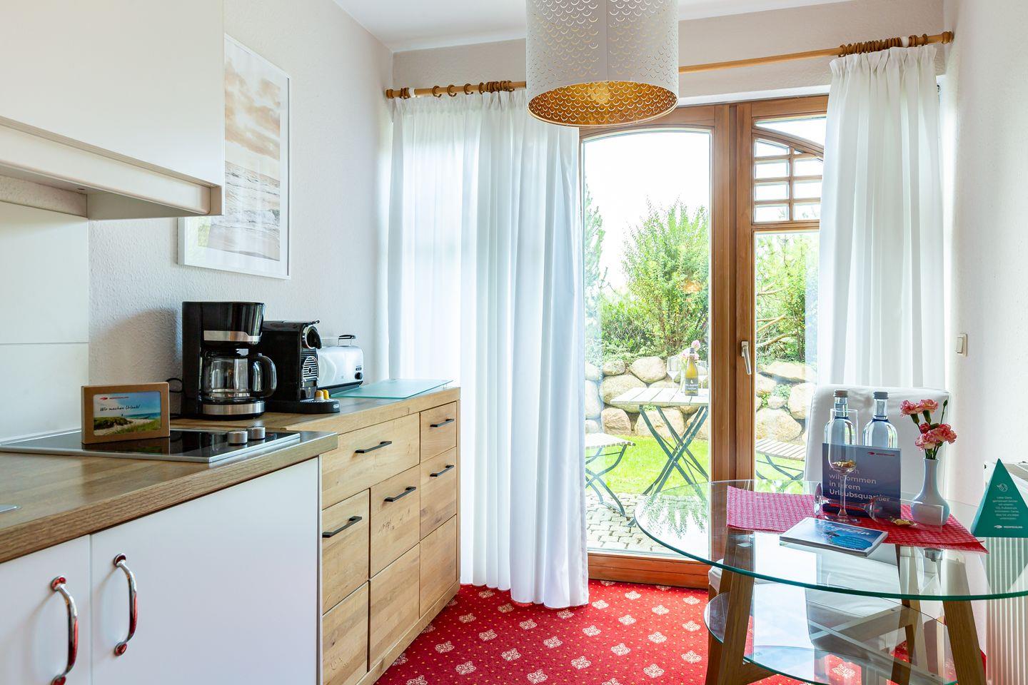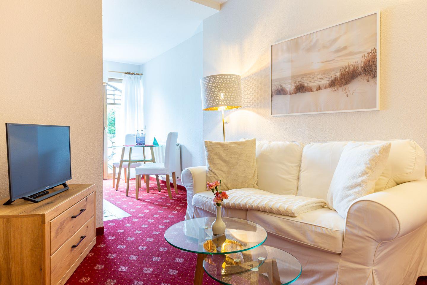 Das gemütliche Einraum-Appartement ist passend zum Strand mit Holz und hellen Farben eingerichtet. Im Wohn- und Schlafraum befinden sich eine kleine Sitzgelegenheit, ein Doppelbett, eine Miniküche und ein Esstisch an bodentiefen Fenstern. Das separate Bad mit Dusche/ WC schließt sich dem Wohnraum an.