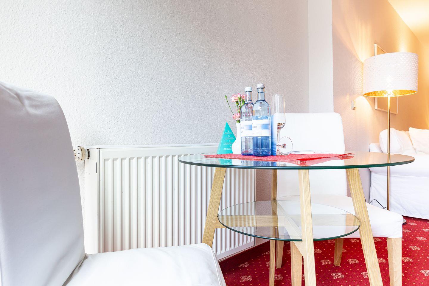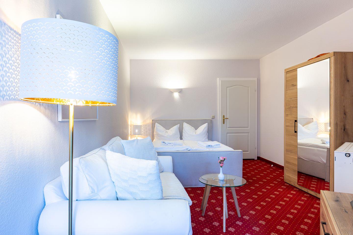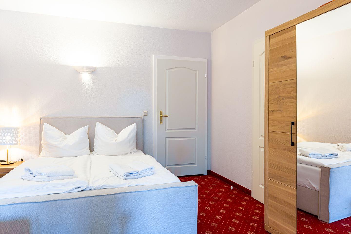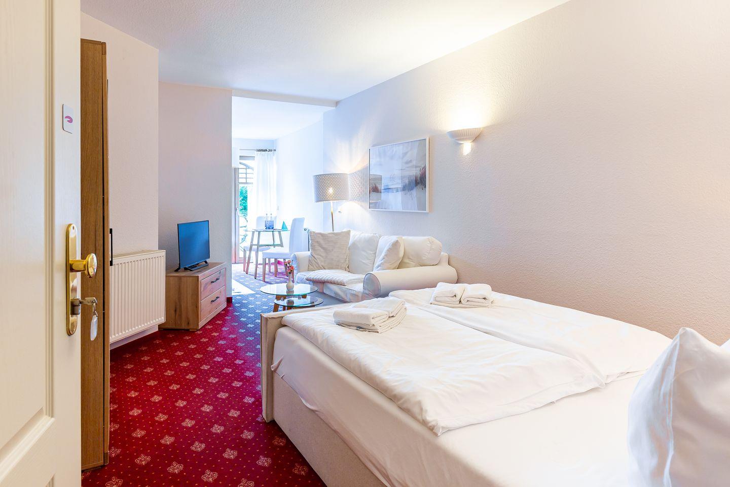 Das gemütliche Einraum-Appartement ist passend zum Strand mit Holz und hellen Farben eingerichtet. Im Wohn- und Schlafraum befinden sich eine kleine Sitzgelegenheit, ein Doppelbett, eine Miniküche und ein Esstisch an bodentiefen Fenstern. Das separate Bad mit Dusche/ WC schließt sich dem Wohnraum an.