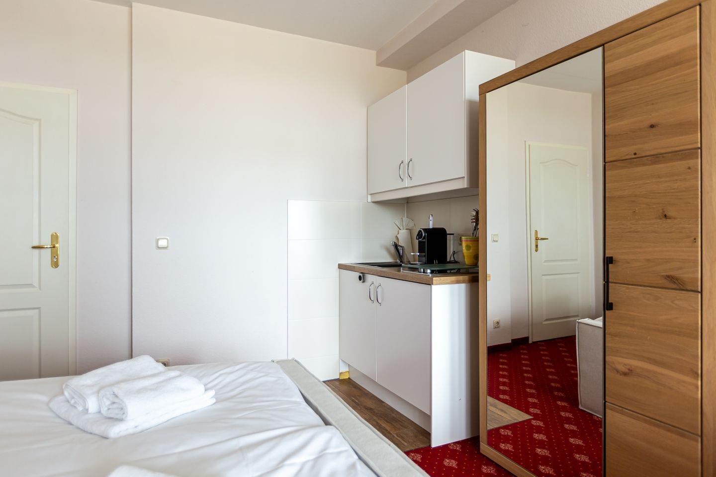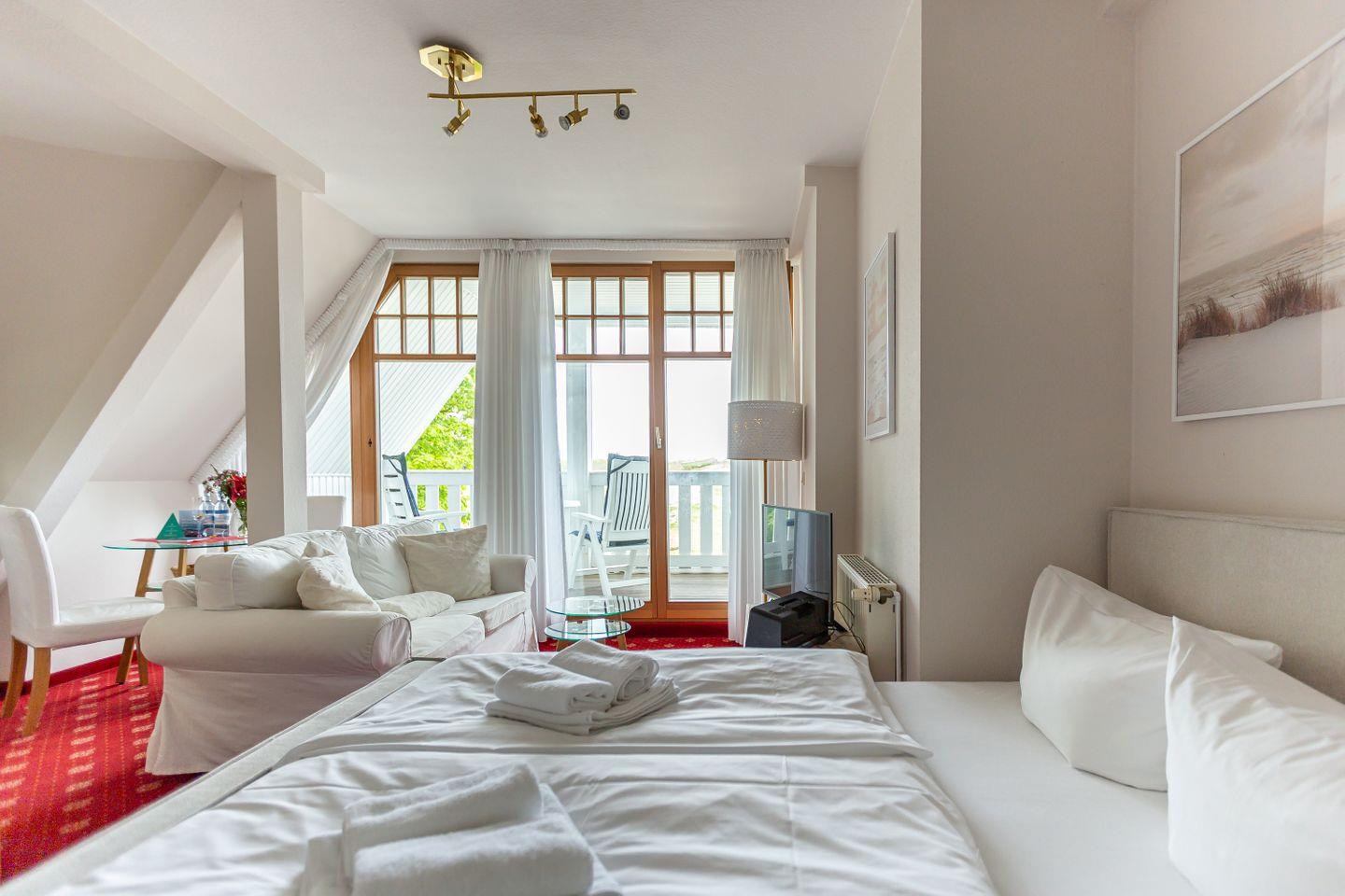 Das gemütliche Einraum-Appartement wurde Anfang 2024 mit neuen Möbeln ausgestattet. Es befindet sich im ersten Stock des Hauses und ist passend zum Strand mit Holz und hellen Farben eingerichtet. Im Wohn- und Schlafraum befinden sich eine kleine Sitzgelegenheit, ein Doppelbett, eine Miniküche und ein Esstisch an bodentiefen Fenstern. Das separate Bad mit Dusche/ WC schließt sich dem Wohnraum an.