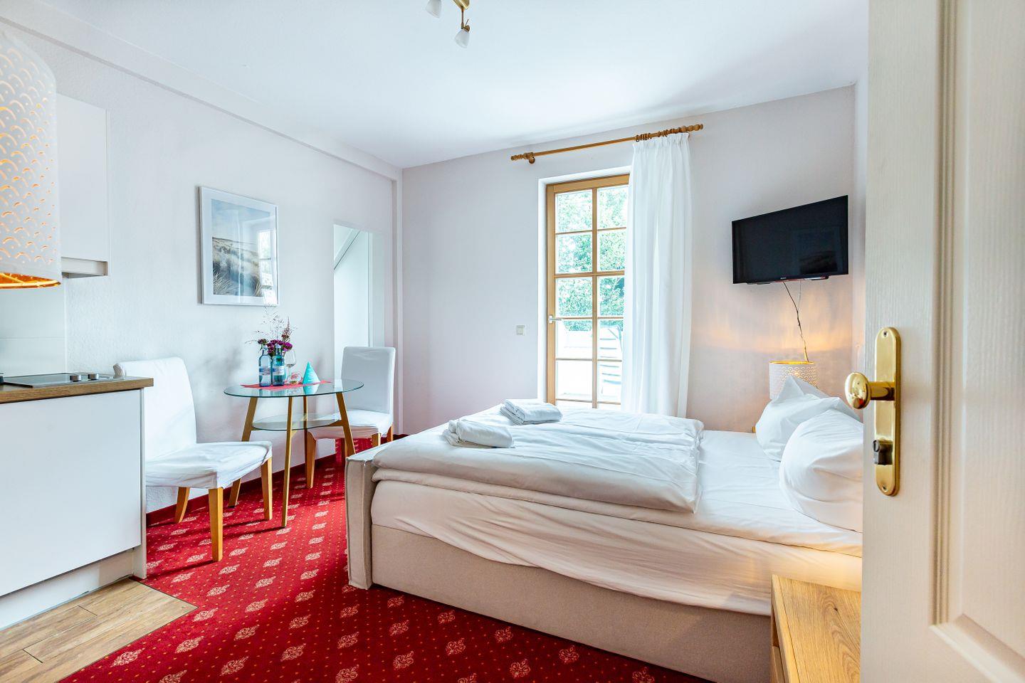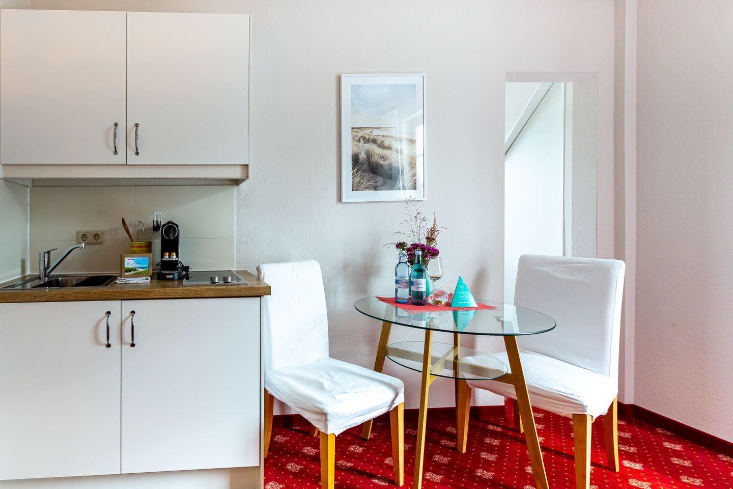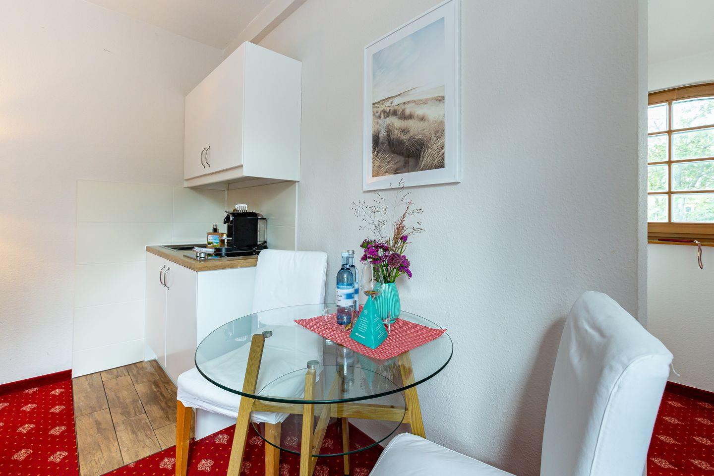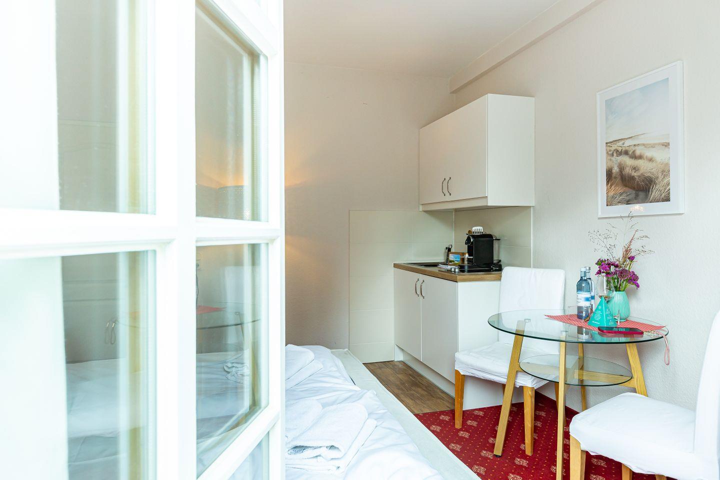 Das gemütliche Einraum-Appartement wurde Anfang 2024 modernisiert und mit neuen Möbeln ausgestattet. Es befindet sich im ersten Stock und ist passend zum Strand mit Holz und hellen Farben eingerichtet. Im Wohn- und Schlafraum befinden sich eine kleine Sitzgelegenheit, ein Doppelbett (140 cm), eine Miniküche und ein Esstisch an bodentiefen Fenstern. Das separate Bad ist mit Dusche/WC ausgestattet.