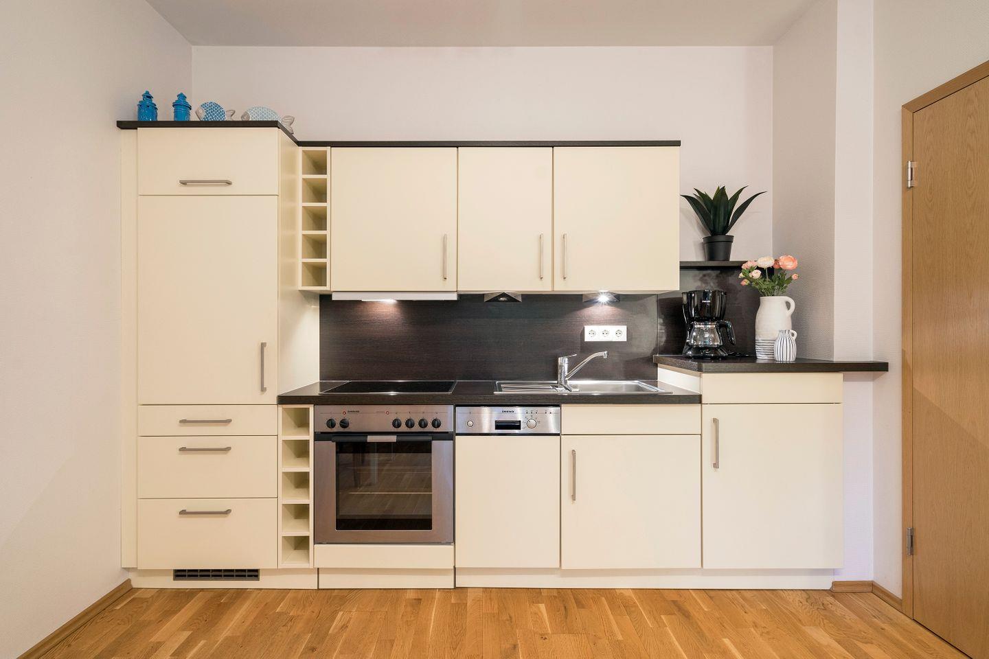 Die Wohnung ist ebenerdig und stufenfrei zu Wohnbereich, Schlafzimmer, Küche sowie Bad und Dusche zugänglich. Damit ist sie barrierearm und gut für Gäste mit eingeschränkter Mobilität geeignet. Lediglich vom Parkplatz und zur Wohnung führen einige Stufen.