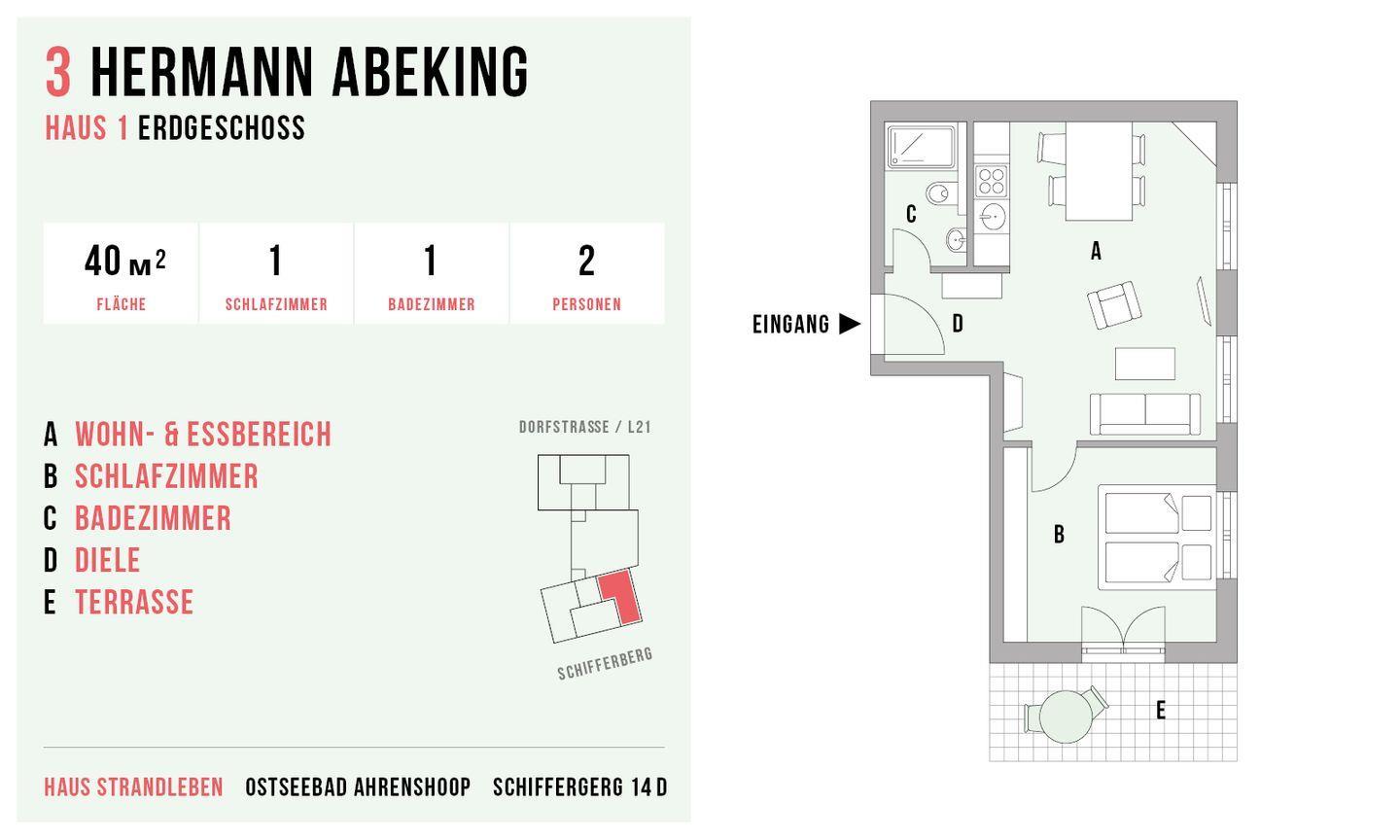 Die Hausanlage mit zwölf Ferienwohnungen liegt nur 150 Meter vom weißen Ostseestrand entfernt und befindet sich direkt an der Bäderstraße L21. Neben der strandnahen Lage ist auch der Ortskern mit Bäckereien und einer Vielzahl von Restaurants, Cafés und Kunstgalerien nur ca. einen Kilometer entfernt. Der angrenzende Deich eignet sich perfekt für Wanderungen oder Radtouren in den Nationalpark, zum Weststrand und entlang der weiten Boddenlandschaft.