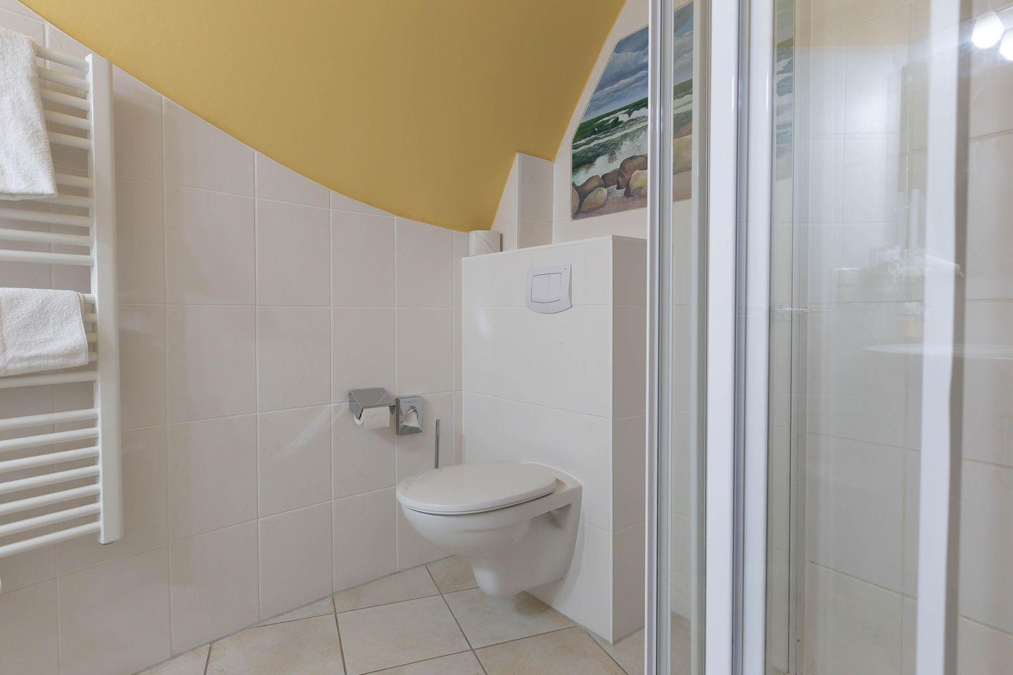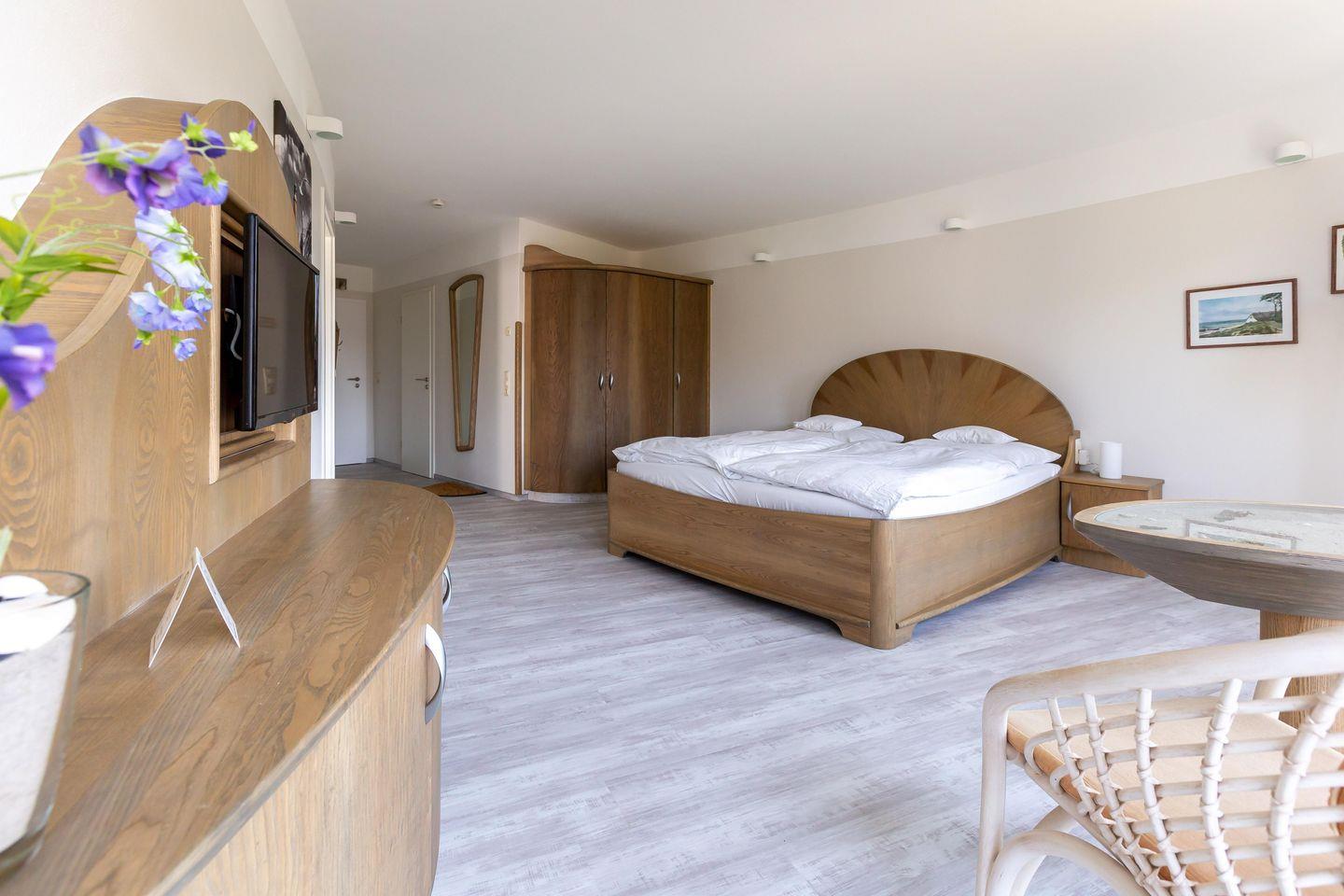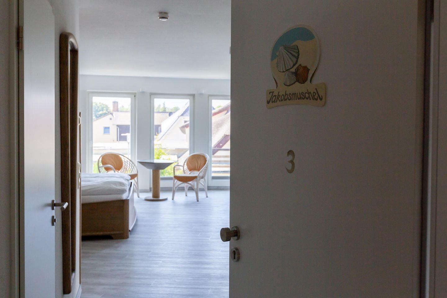 Die Unterkunft „Muschel 3“ befindet sich im ersten Obergeschoss. Großzügige Räume, helle Farben und modernes Mobiliar machen diese Ferienwohnung zu einem besonderen Urlaubsdomizil. Vom Flur mit Garderobe kommst du direkt in das erste Schlafzimmer, dass mit einem großen Doppelbett, Kleiderschrank, Sitzgelegenheit, TV und bodentiefen Fenstern ausgestattet ist. Auch ein Badezimmer mit Dusche und WC kannst du vom Flur aus betreten. Durch eine Tür gelangst du in den großzügigen Wohn- und Schlafbereich. Die vollausgestattete Küchenzeile ist offen integriert und lädt mit Herd, Backofen, Geschirrspüler und Essbereich zum Kochen und Klönen ein. Das gemütliche Sofa kann ausgezogen werden und bietet mit 160 cm Liegefläche einen komfortablen Schlafplatz für bis zu zwei Personen. Abgerundet wird die neu modernisierte Ferienwohnung durch ein zweites Bad mit Dusche und WC.