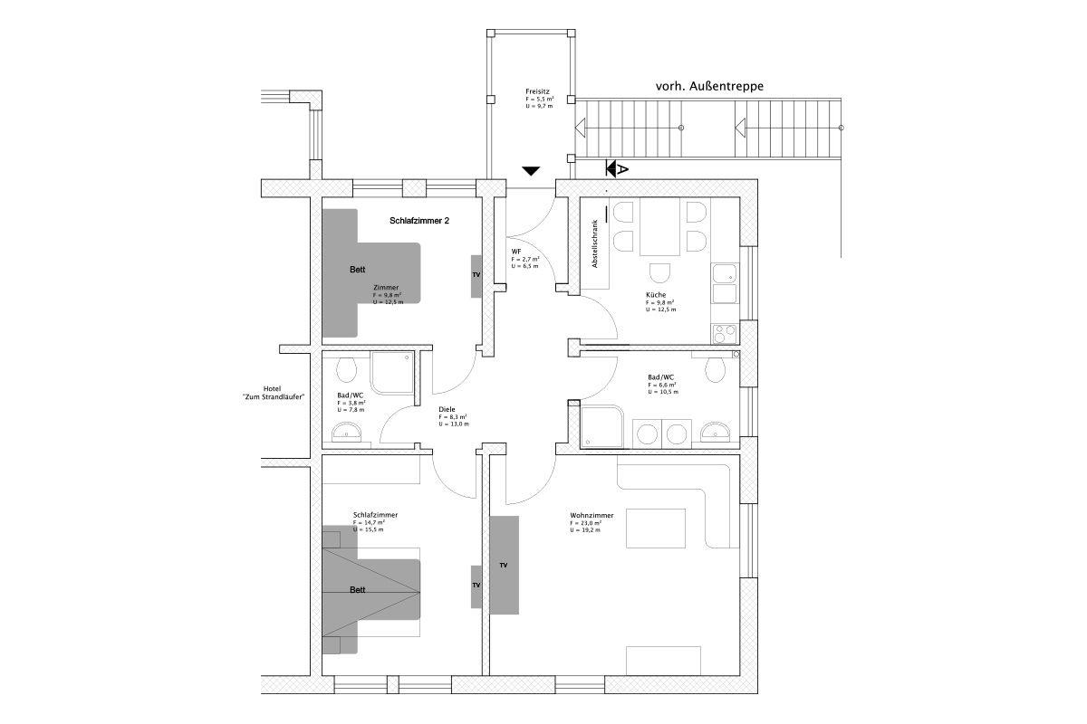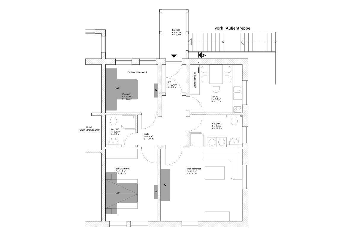 Die Unterkunft „Strandläufer 2“ befindet sich im ersten Obergeschoss des Haupthauses Strandläufer und ist über eine Außentreppe zu erreichen. Großzügige Räume, helle Farben und ein Mix aus modernem Mobiliar und Möbeln im Stil der Gründerzeit machen diese Ferienwohnung zu einem besonderen Urlaubsdomizil. Vom Flur mit Garderobe gelangst du direkt in das großzügige Wohnzimmer mit gemütlicher Couch und TV. Dieses kann bei Bedarf ausgezogen werden und dient als Aufbettung für bis zu zwei Personen. Die zwei gemütlichen Schlafzimmer sind mit je einem Doppelbett und Kleiderschrank ausgestattet. Somit gibt es hier ausreichend Rückzugsorte und erholsame Nächte. Auch die vollausgestattete Küche mit seinem großzügigen Esstisch lässt keine Wünsche offen. Hier findet die ganze Familie beim gemeinsamen Kochen und Klönen Platz. Für noch mehr Wohnkomfort sorgen die beiden Badezimmer mit Dusche und WC.