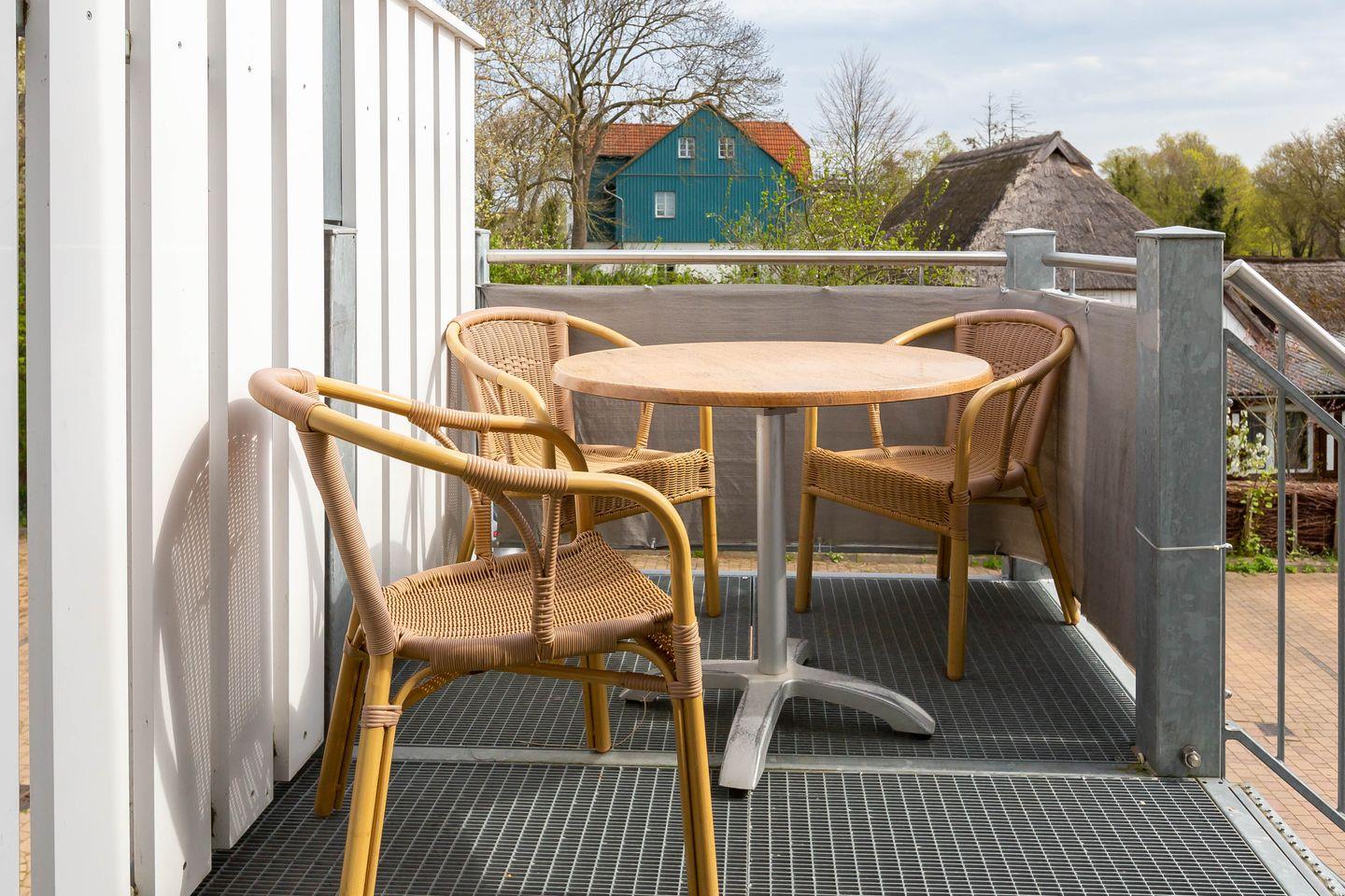 An der Treppe zum Wohnungseingang steht dir eine Sitzgelegenheit mit Tisch und Stühlen für den ersten Kaffee am Morgen zur Verfügung.