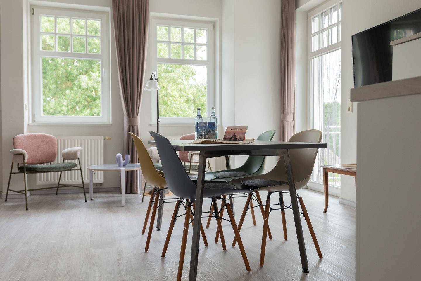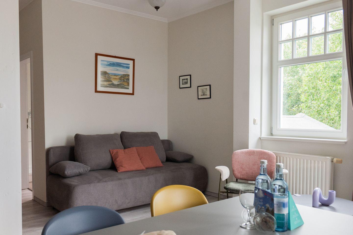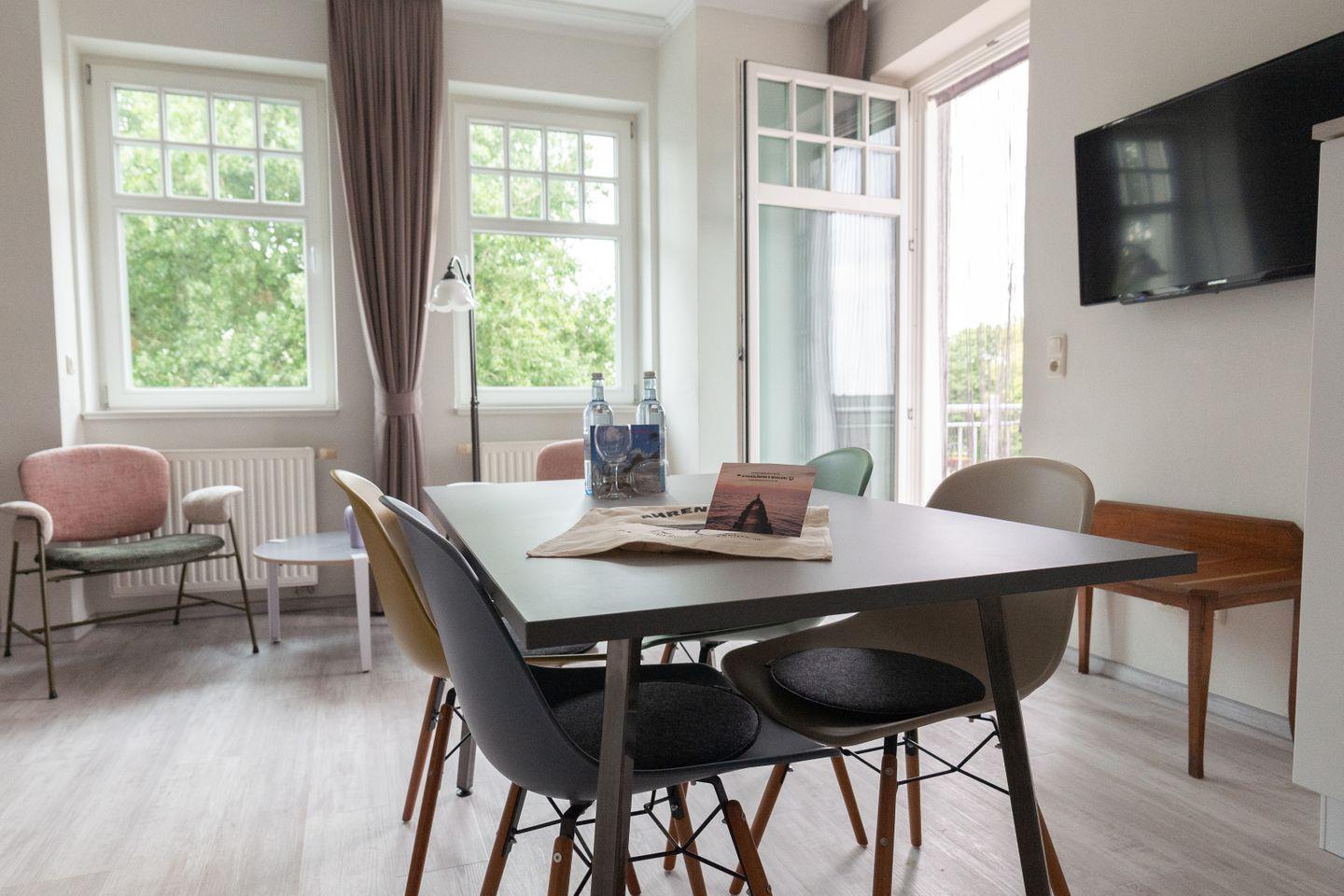 Die Unterkunft „Strandläufer 4“ befindet sich im zweiten Obergeschoss des Haupthauses Strandläufer und ist über den Seiteneingang zu erreichen. Großzügige Räume, helle Farben und ein Mix aus modernem Mobiliar und Möbeln im Stil der Gründerzeit machen diese Ferienwohnung zu einem besonderen Urlaubsdomizil. Vom Flur mit Garderobe gelangst du direkt in den offen gestalteten Wohn-und Küchenbereich mit Austritt auf den Balkon. Ob mit Familie oder Freunden, es gibt genügend Platz zum gemeinsamen Kochen und Klönen. Die gemütliche Couch im Wohnraum kann ausgezogen werden und dient als Aufbettung für bis zu zwei Personen. Ein weiteres Highlight bietet das Schlafzimmer in Richtung Ostsee. Hier genießt du einen traumhaften Blick auf das Meer mit seinen spektakulären Sonnenuntergängen. Ausgestattet mit einem großem Doppelbett, bekommst du garantiert den erholsamen Schlaf, den du dir im Urlaub wünschst. Für noch mehr Wohnkomfort sorgen die beiden Badezimmer mit Dusche und WC.