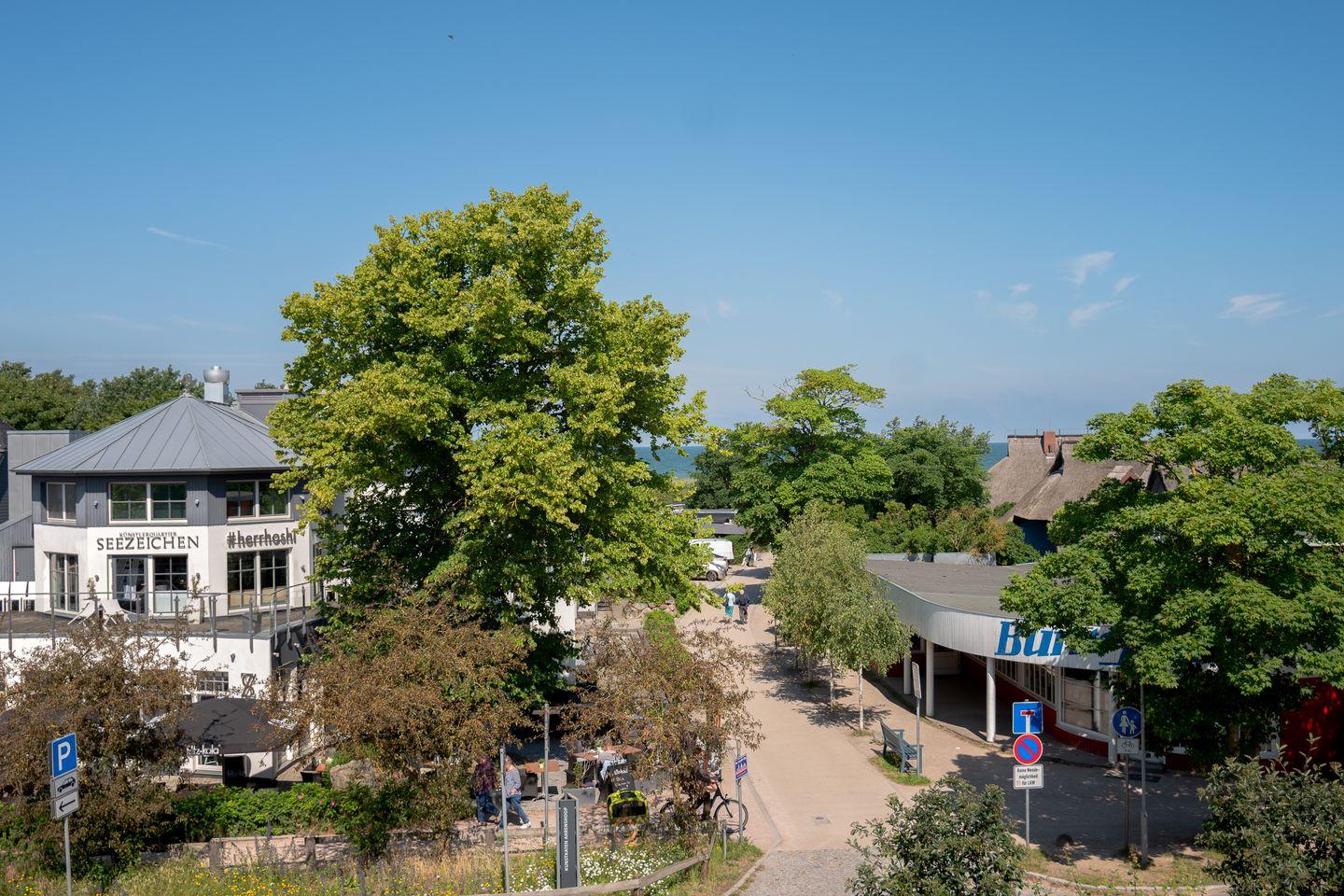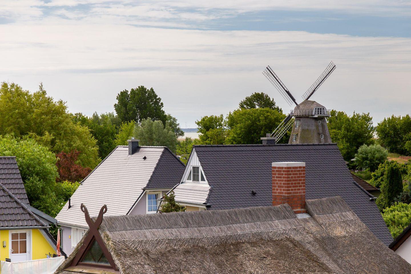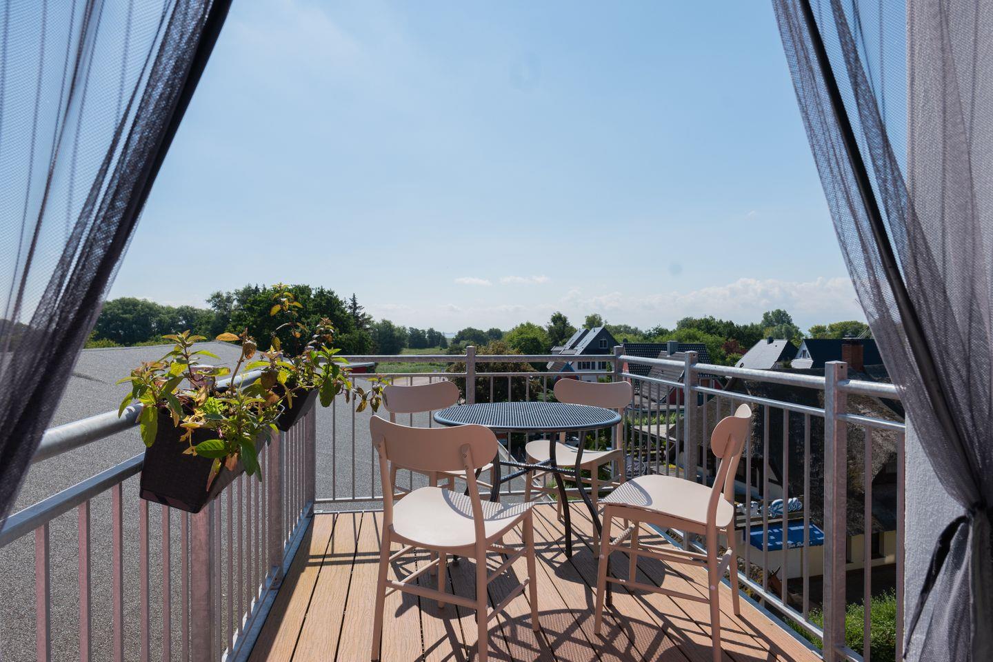 Im Außenbereich steht dir ein Balkon mit Tisch und Stühlen zur Verfügung. Der herrliche Ausblick wird dich begeistern. Denn hier kann dein Blick über die Reetdächer bis zum Bodden schweifen. Es ist der perfekte Platz, um einen der berühmten und lichtdurchtränkten Sonnenaufgänge zu beobachten, die so einmalig auf der Halbinsel sind.