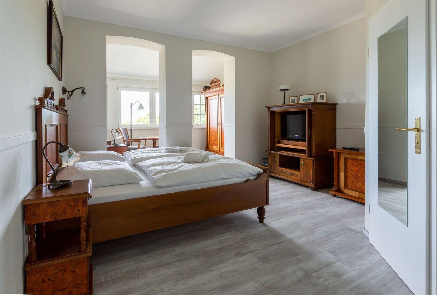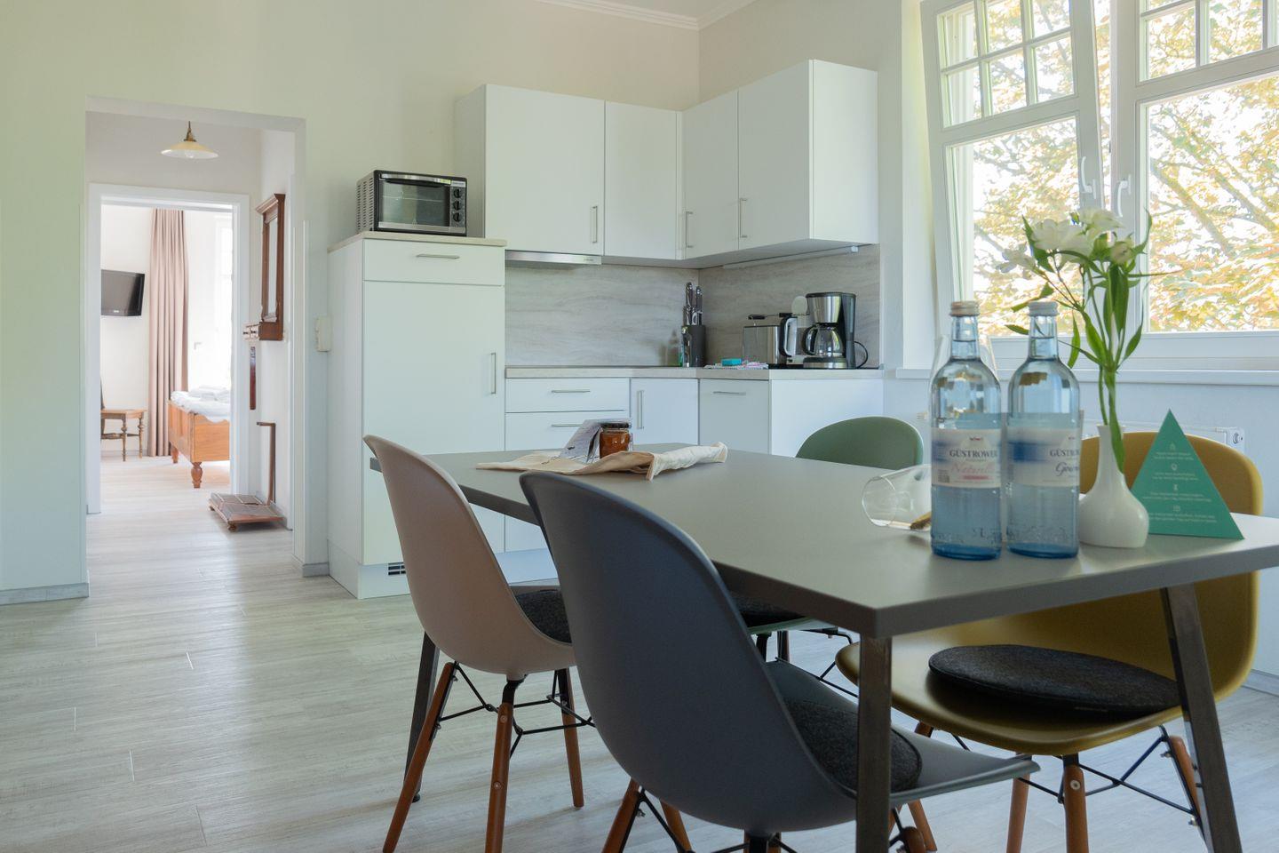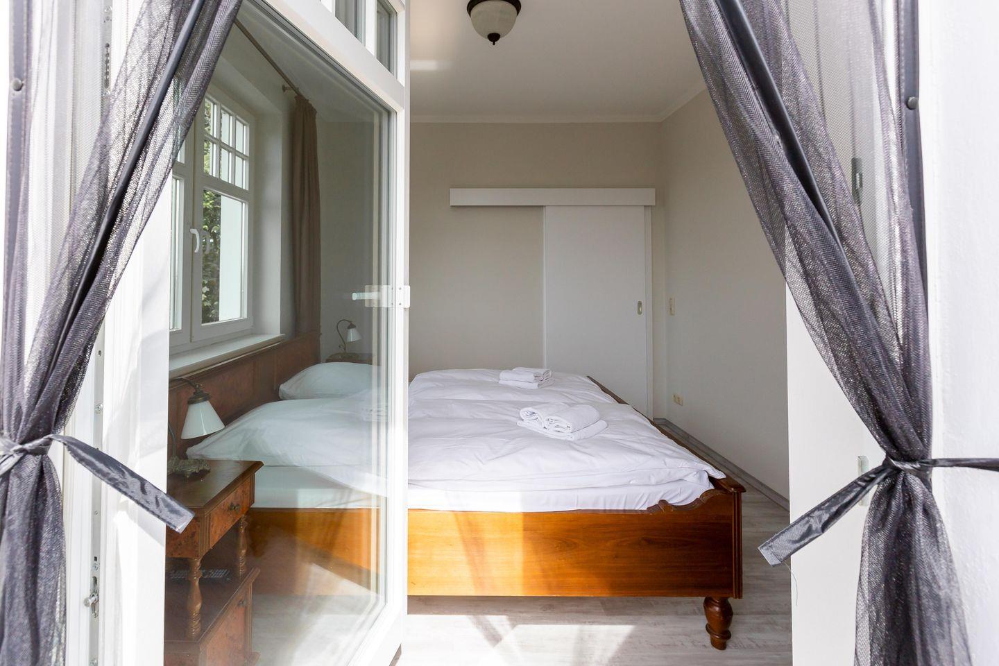 Die Unterkunft „Strandläufer 3“ befindet sich im zweiten Obergeschoss des Haupthauses Strandläufer und ist über den Seiteneingang zu erreichen. Großzügige Räume, helle Farben und ein Mix aus modernem Mobiliar und Möbeln im Stil der Gründerzeit machen diese Ferienwohnung zu einem besonderen Urlaubsdomizil. Mittelpunkt der Wohnung ist der offen gestalte Wohnbereich mit vollausgestatteter Küchenzeile und Esstisch mit Ausblick auf die Ostsee. Ob mit Familie oder Freunden, hier gibt es genügend Platz zum gemeinsamen Kochen und Klönen. Ebenso großzügig wie der Wohnraum sind auch die beiden Schlafzimmer der Ferienwohnung. Ausgestattet mit je einem Doppelbett, Kleiderschrank, TV und Sitzgelegenheiten, findest du hier einen erholsamen Schlaf. Besonderes Highlight: Auch eins der Schlafzimmer zeigt in Richtung Ostsee. Hier genießt du einen einmaligen Blick auf das Meer mit seinen spektakulären Sonnenuntergängen. Das zweite Schlafzimmer verfügt über einen Balkon mit herrlichem Blick auf den Bodden. Für weiteren Wohnkomfort sorgen die beiden Badezimmer mit Dusche und WC.
