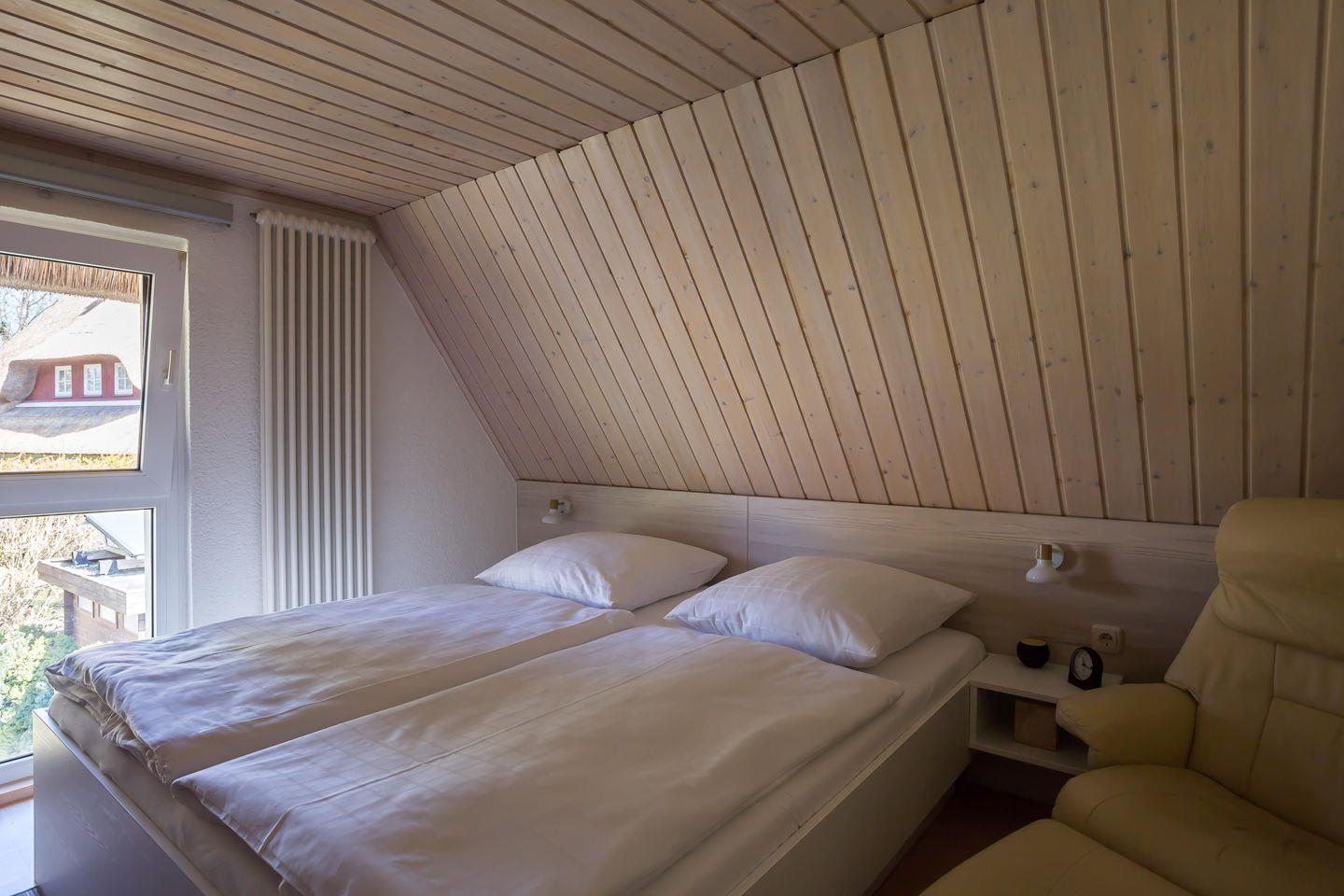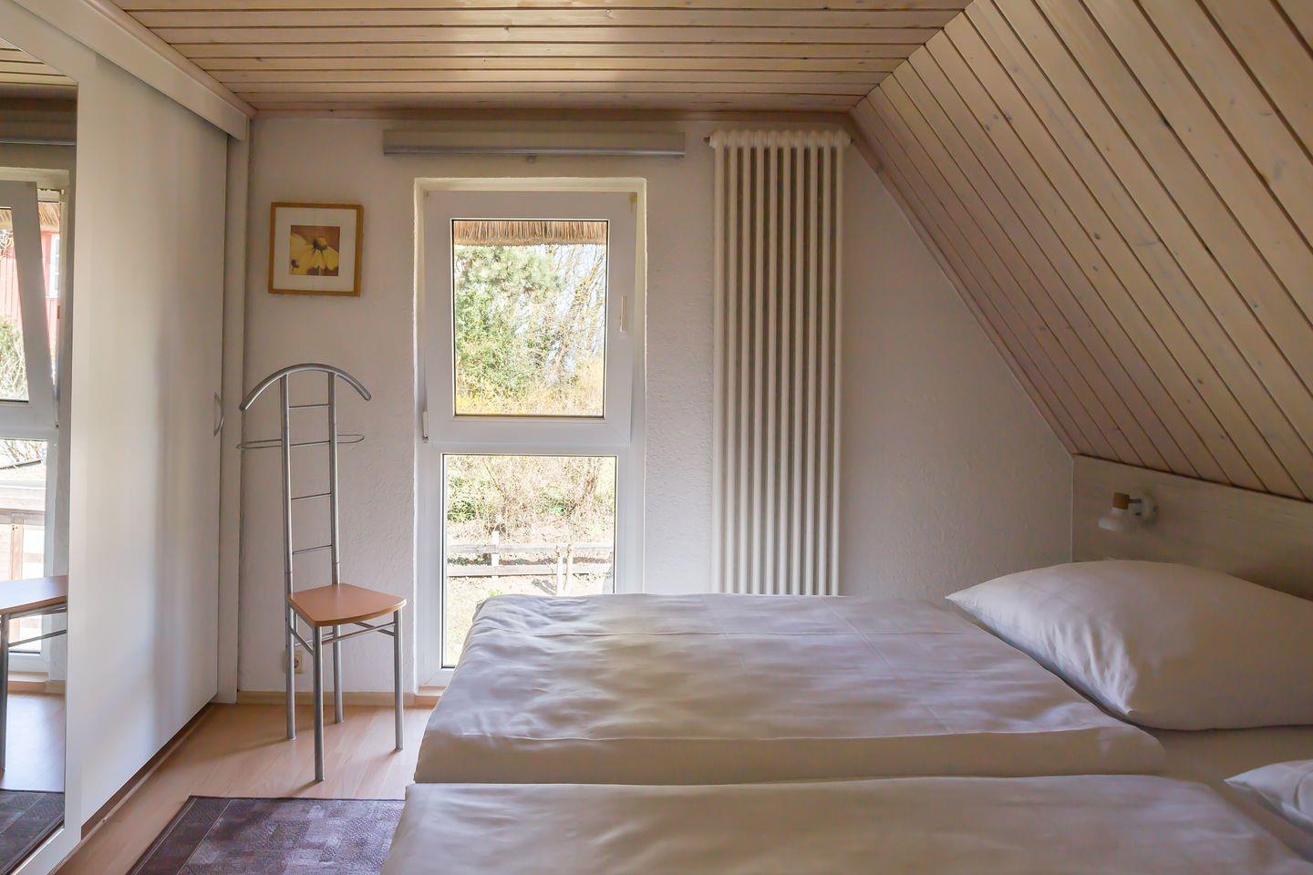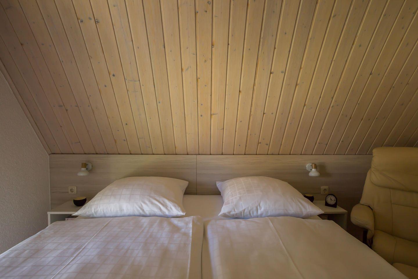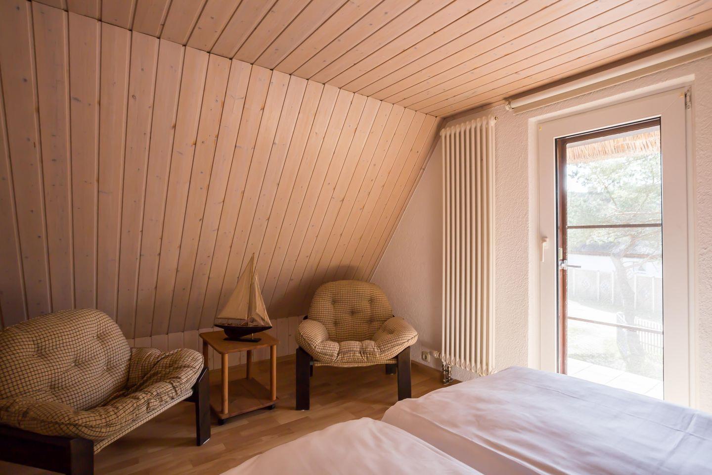Mittelpunkt des Hauses ist das lichtdurchflutete Wohnzimmer mit Zugang zur Terrasse, großen Fensterfronten, Esstisch und gemütlicher Couch, die bei Bedarf eine zusätzliche Aufbettung für eine fünfte Person bietet. Die vollausgestattete Küche befindet sich eine Tür weiter. Hier findest du alles, was du zum Kochen brauchst. Selbst eine Durchreiche zum Wohnzimmer gibt es. Wir finden’s charmant, wie den Rest vom Ferienhaus. Ein erstes Badezimmer mit Dusche und WC betrittst du vom Flur im Erdgeschoss. Über eine Treppe im Wohnbereich gelangst du zu den beiden Schlafzimmern des Hauses. Ausgestattet mit gemütlichen Doppelbetten und Stauraum für die Sachen bekommst du hier garantiert den erholsamen Schlaf, den man sich im Urlaub wünscht. Abgerundet wird der Wohnkomfort durch ein zweites Tageslichtbad mit Dusche und WC.