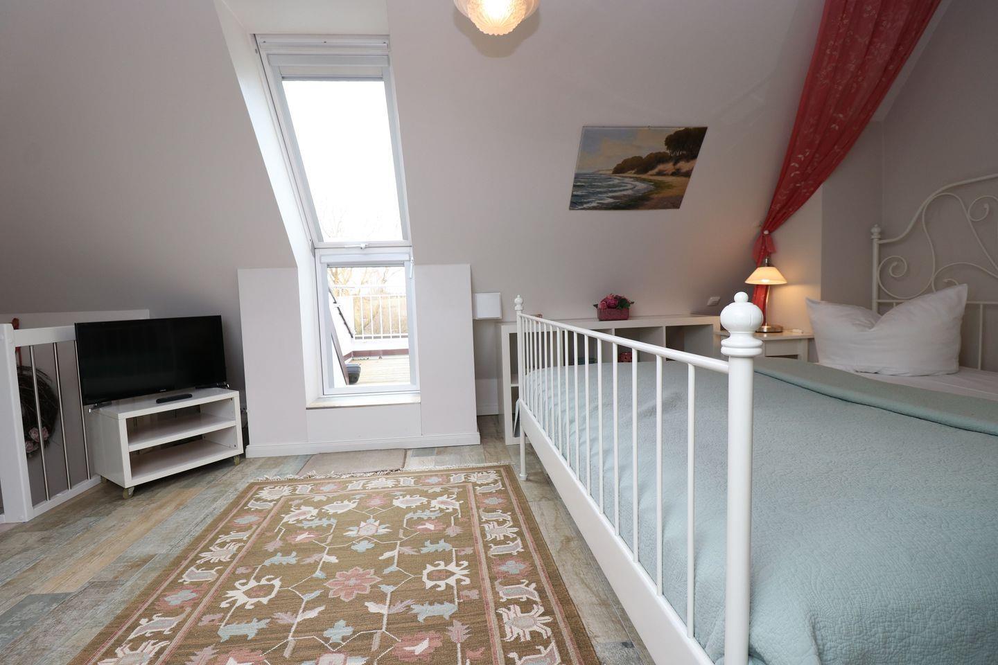 Ein gemütliches Maisonette-Appartement im Obergeschoss, perfekt für maximal 4 Personen. Genießen Sie ein Ost-Balkon mit Blick auf den Bodden, ideal für entspannte Stunden im Freien und wunderschöne Sonnenuntergänge. Im Obergeschoss befindet sich das Wohnzimmer mit Schlafcouch und einer praktischen Küchenzeile, damit Sie sich selbst versorgen können, sowie ein Bad mit einer Dusche und WC. Das Schlafzimmer befindet sich im Dachgeschoss und verfügt über ein komfortables Doppelbett für erholsamen Schlaf. Haustiere und das Rauchen sind in der Wohnung nicht gestattet, jedoch gibt es WLAN für einen bequemen Internetzugang während des Aufenthalts. Eine Waschmaschine und Trockner stehen gegen Gebühr im Gemeinschaftsraum in der Tiefgarage zur Verfügung. Ein Tiefgaragenstellplatz ist ebenfalls vorhanden.