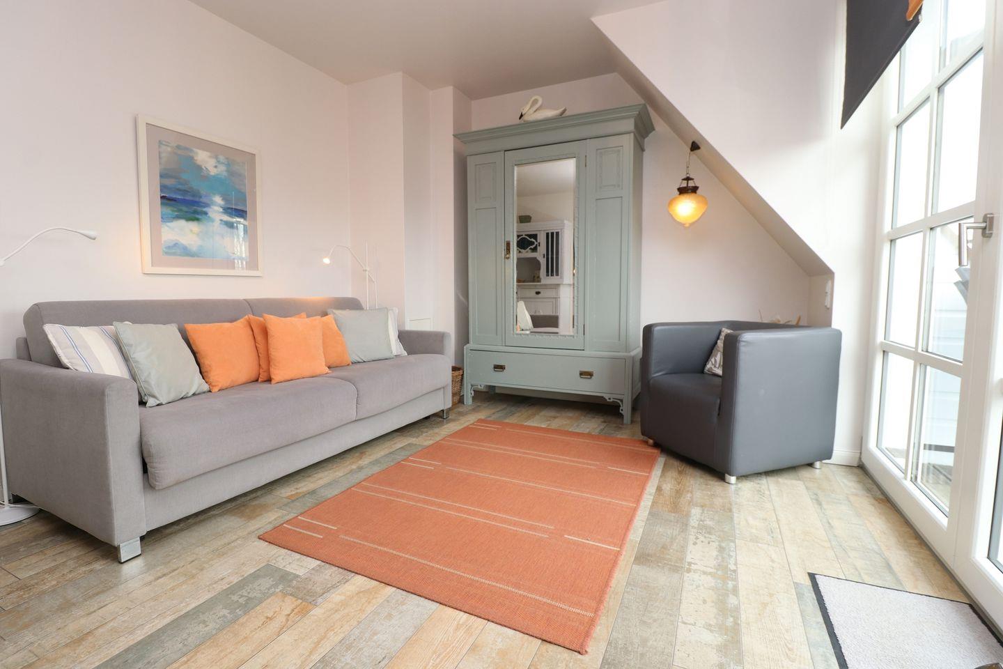 Im Obergeschoss befindet sich der helle Wohnbereich, der mit einer gemütlichen Schlafcouch zusätzlichen Platz für zwei Personen bietet. Die praktische Küchenzeile ermöglicht es Ihnen, Ihre Mahlzeiten ganz nach Wunsch zuzubereiten, während das Badezimmer mit Dusche und WC den Wohnkomfort abrundet.