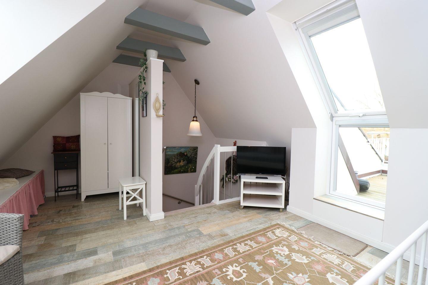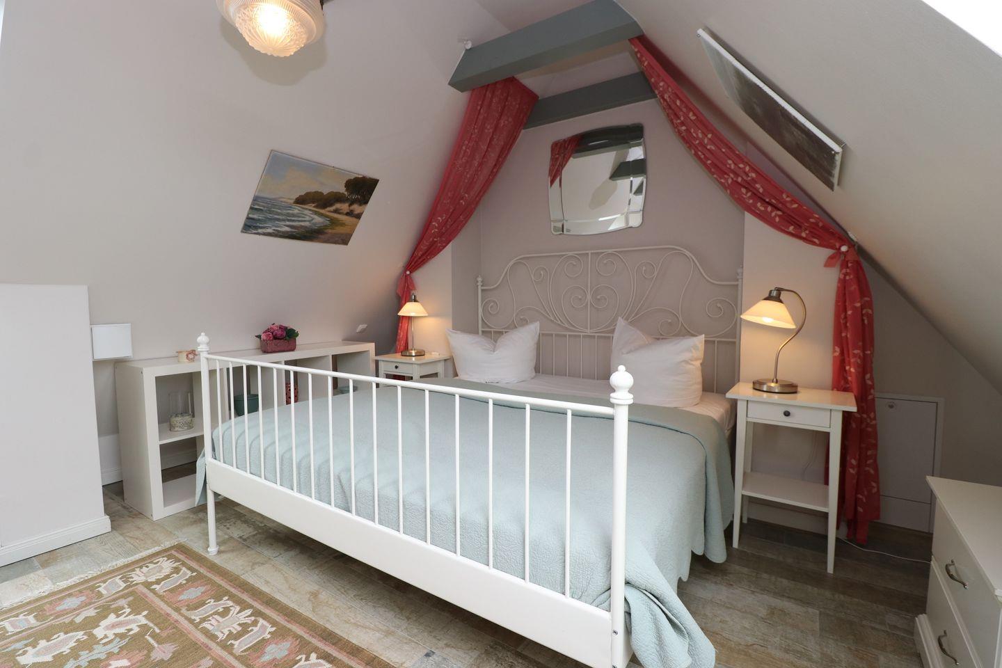 Über eine Treppe gelangen Sie in das Dachgeschoss, wo sich das Schlafzimmer mit komfortablem Doppelbett befindet – ein ruhiger Rückzugsort für erholsame Nächte.