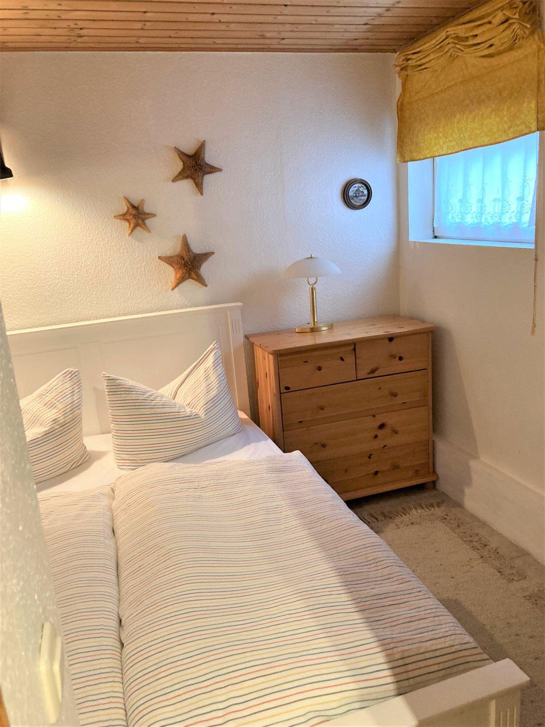Das separate Schlafzimmer mit Doppelbett (140 x 200 cm) sorgt für erholsamen Schlaf und bietet eine ruhige Atmosphäre zum Abschalten nach einem erlebnisreichen Tag an der Küste.