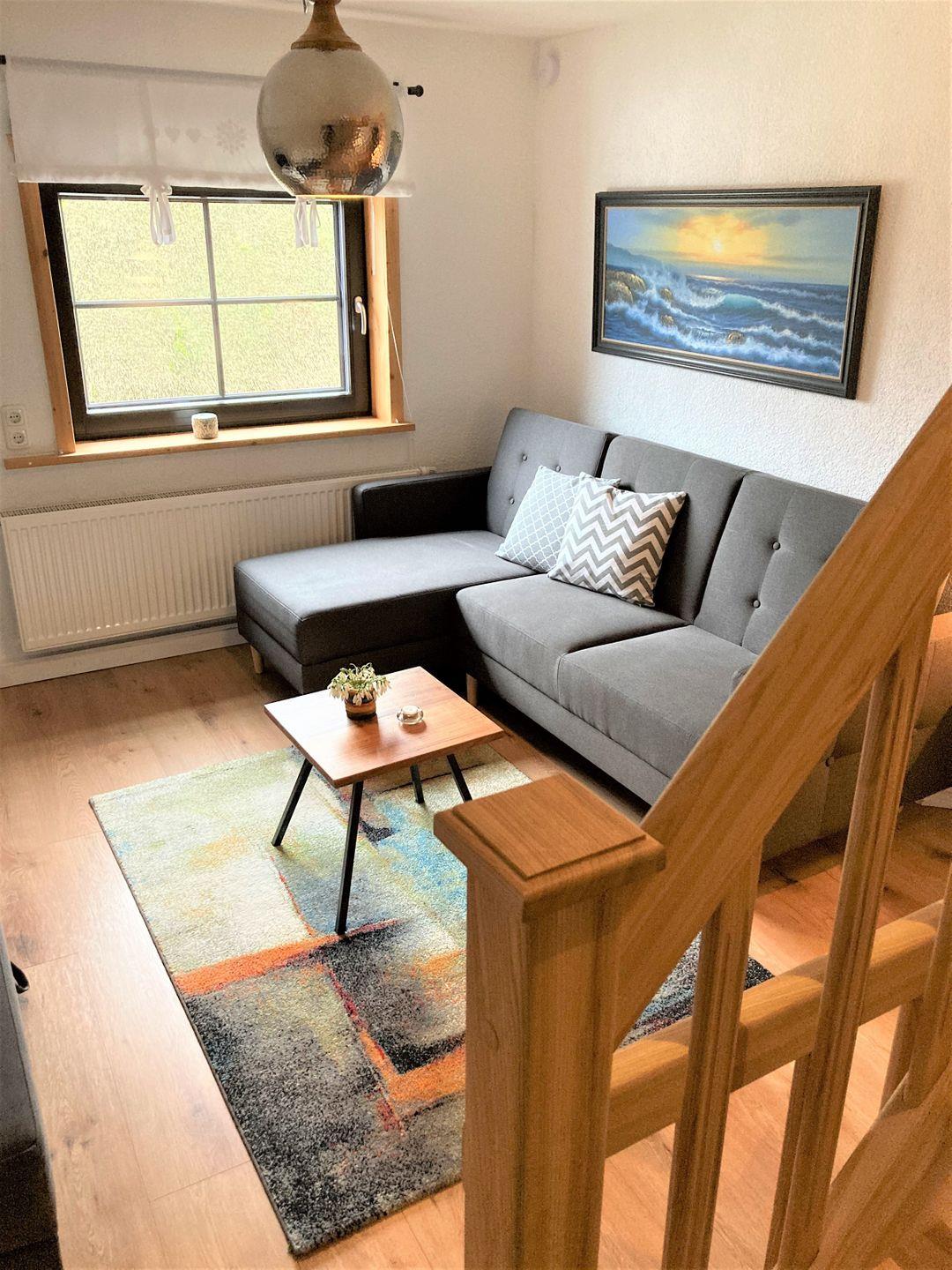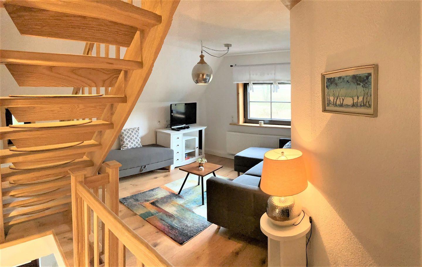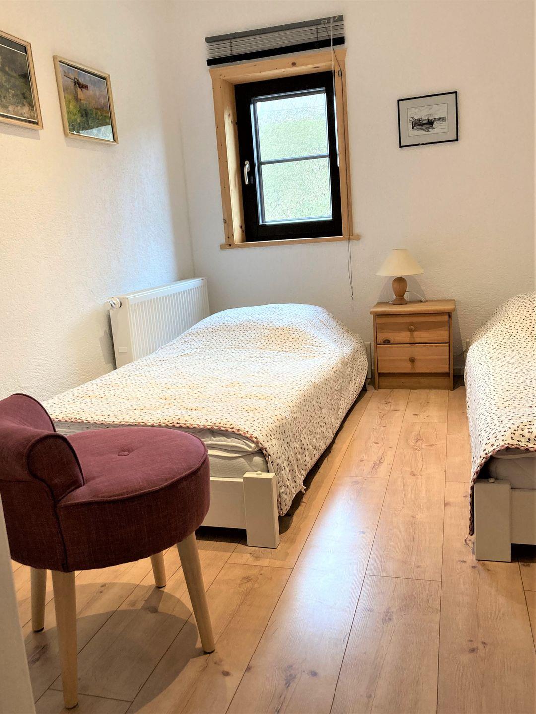 Im ersten Obergeschoss erwartet Sie das gemütliche Wohnzimmer, das zum Verweilen und Entspannen einlädt. Ebenfalls auf dieser Etage befindet sich ein Schlafzimmer mit zwei Einzelbetten – ideal für Kinder oder Freunde.