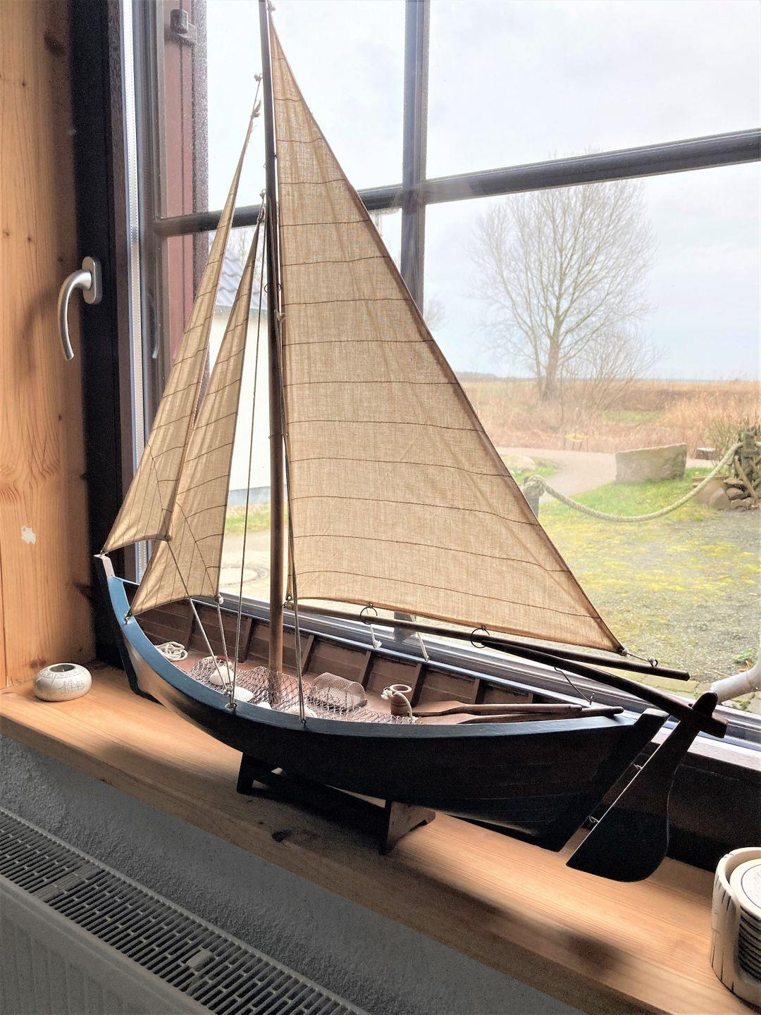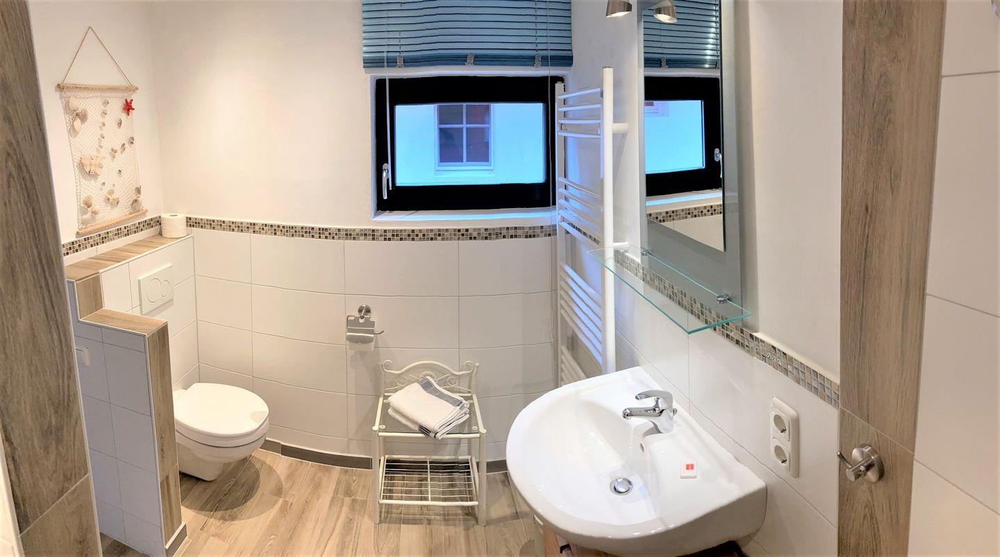 Im Erdgeschoss befinden sich die voll ausgestattete Küche sowie ein modernes Duschbad. Hier können Sie den Tag ganz entspannt beginnen – vielleicht mit einem gemeinsamen Frühstück, bevor Sie zu einem Spaziergang entlang des nahegelegenen Boddens aufbrechen.