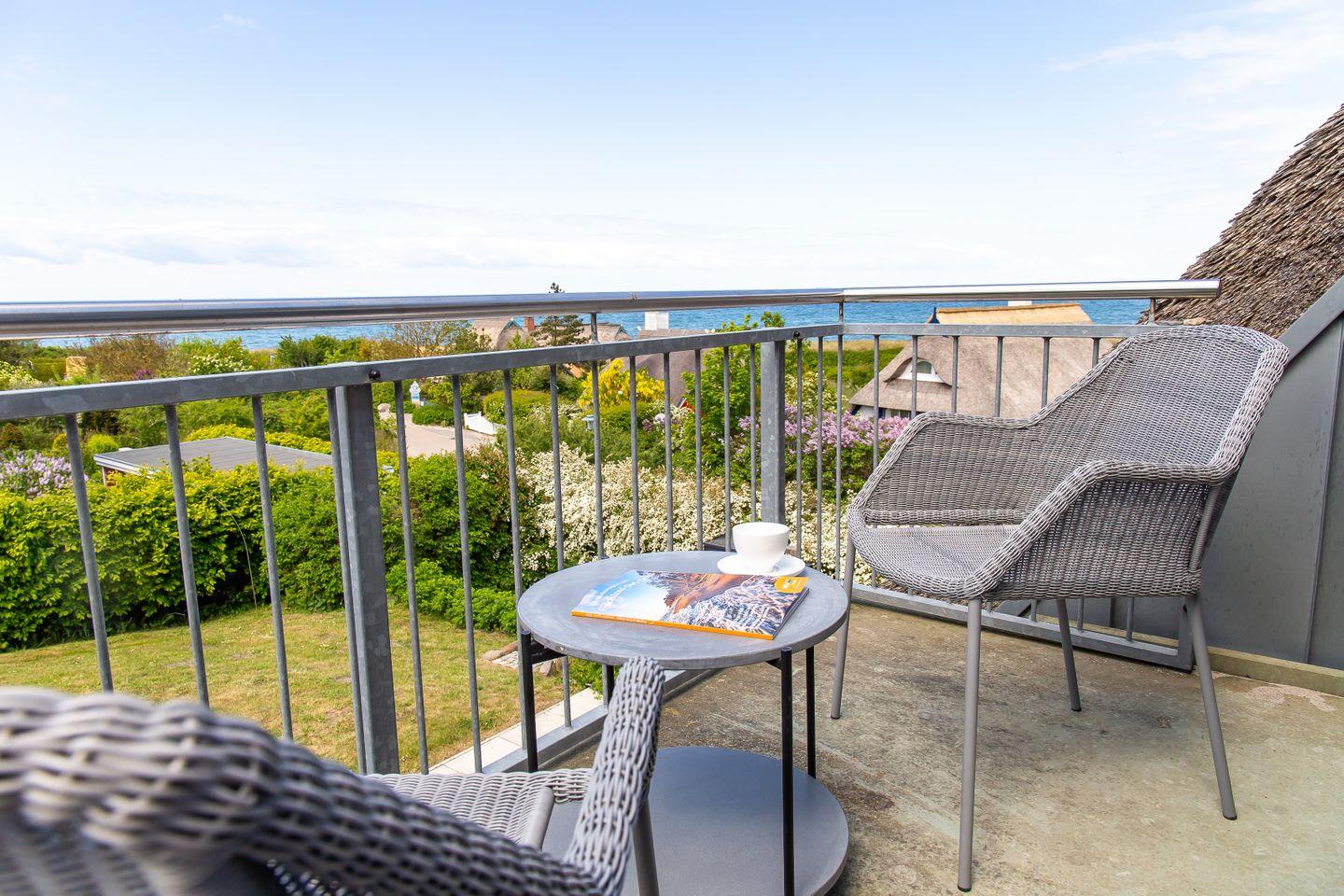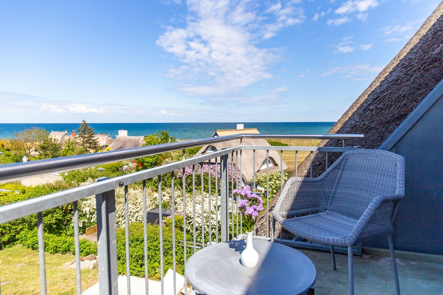 Der westseitige Balkon bietet zudem den idealen Rahmen, um unter freien Himmel neue Energie zu tanken. Mit dem Blick auf das endlose Blau des Meeres, und dem beruhigenden Rauschen der Wellen ist es der perfekte Ort, um den Alltag zu vergessen und vollkommende Entspannung zu genießen.