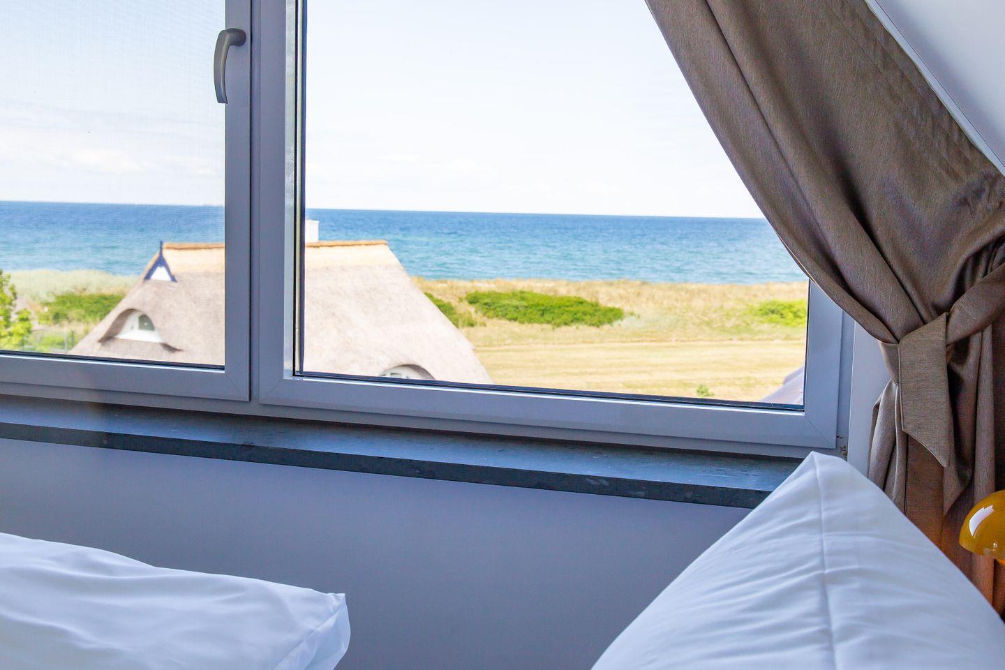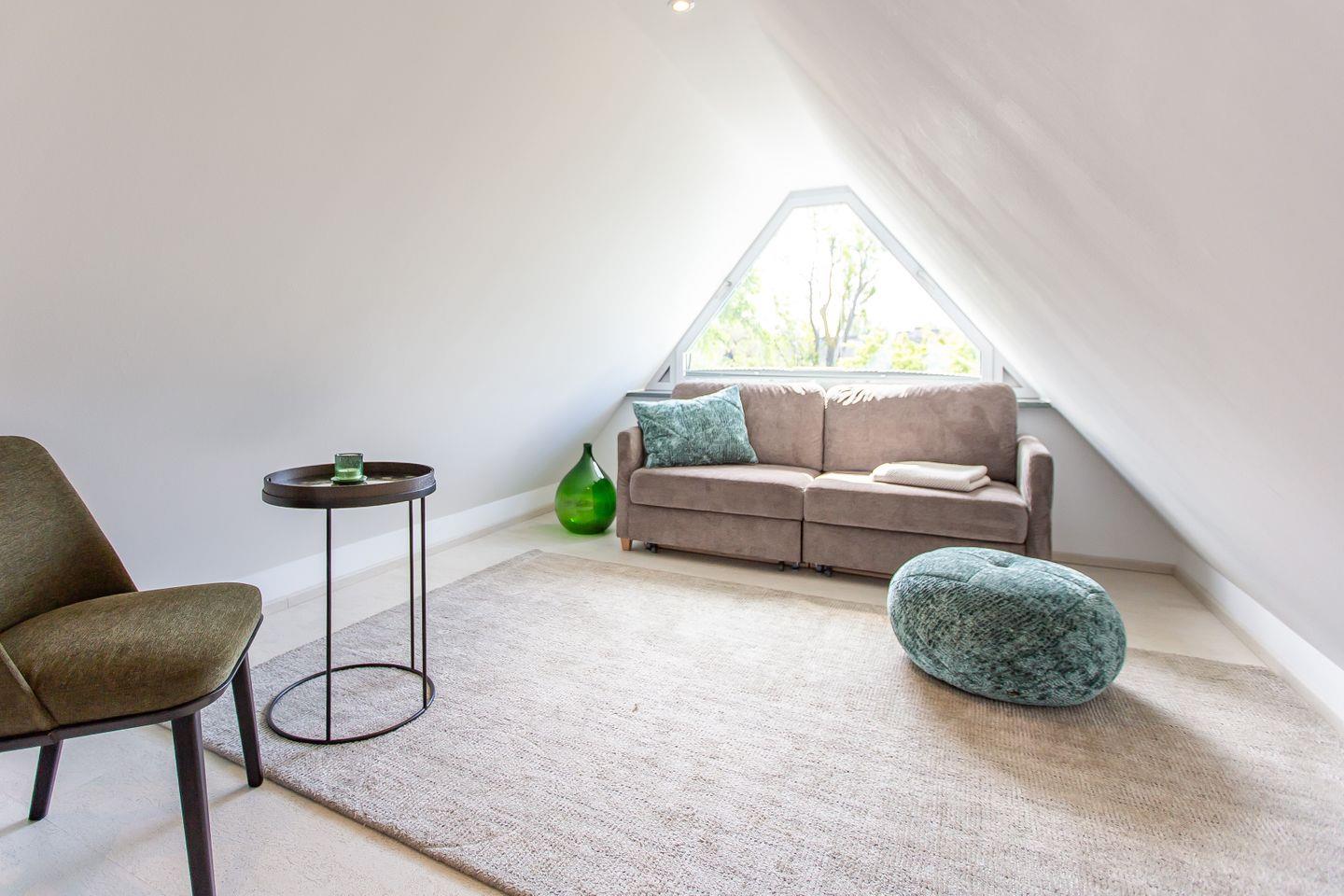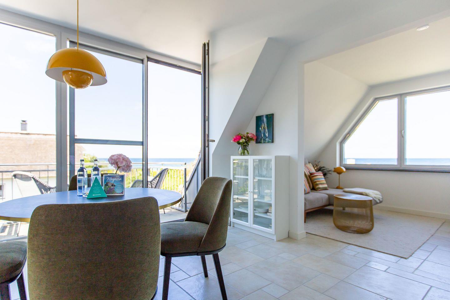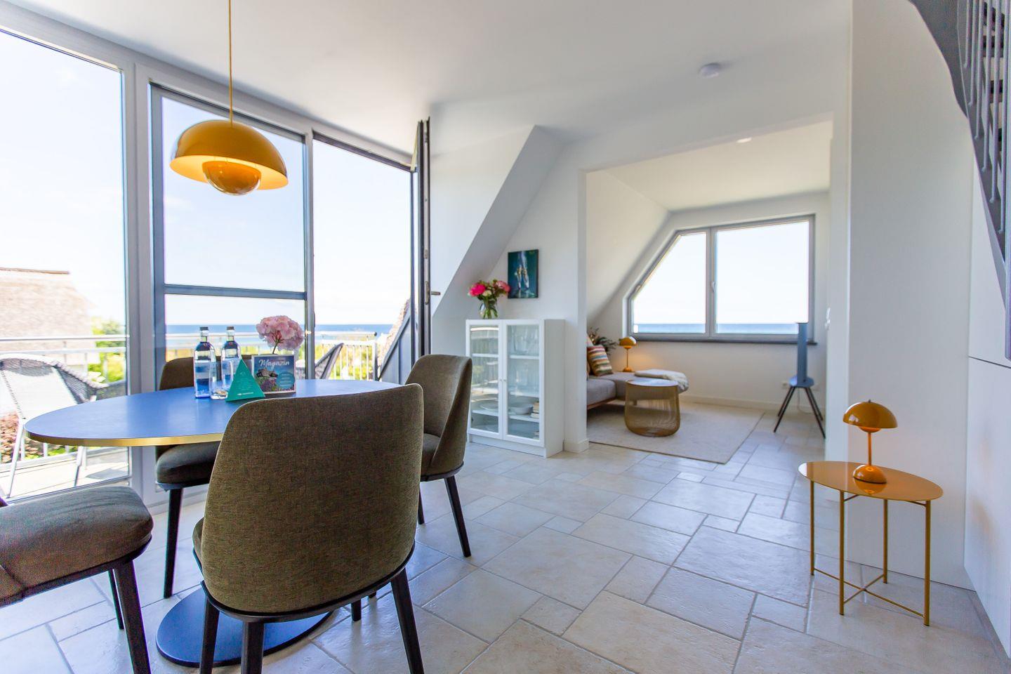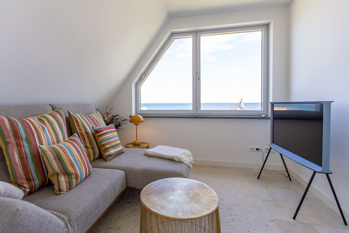 Über eine zusätzliche Treppe gelangst du in das Dachgeschoss. Mit dem Schlafsofa, den Sitzkissen und dem Tagesbett wurde hier ein weiterer Ort der Ruhe und des Rückzugs geschaffen. Der Raum lädt nicht nur als zweites Schlafzimmer ein, sondern auch sich zurückzulehnen, ein gutes Buch zu lesen oder die Lieblingsmusik beim Beobachten des Sonnenuntergangs zu genießen. Denn der Höhepunkt und somit zweifelslos ein atemberaubendes Urlaubserlebnis ist der spektakuläre Ausblick auf das Meer - aus (fast) jedem Raum!