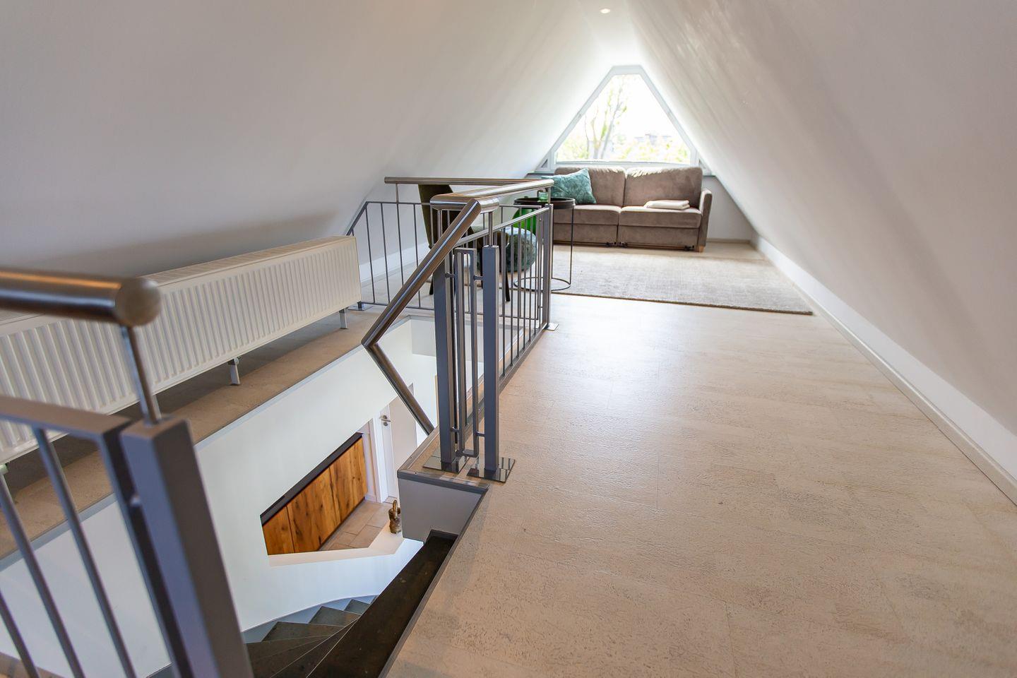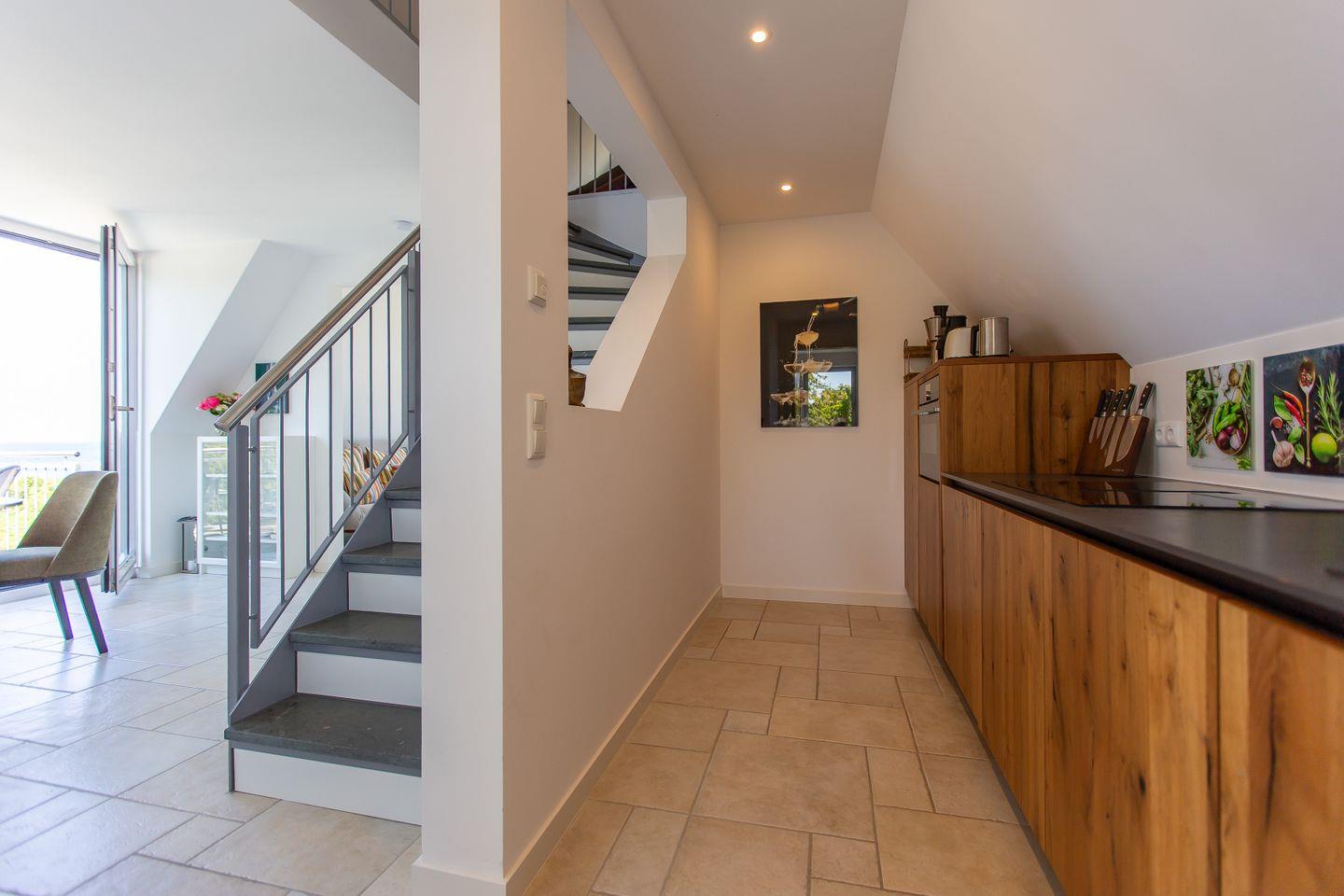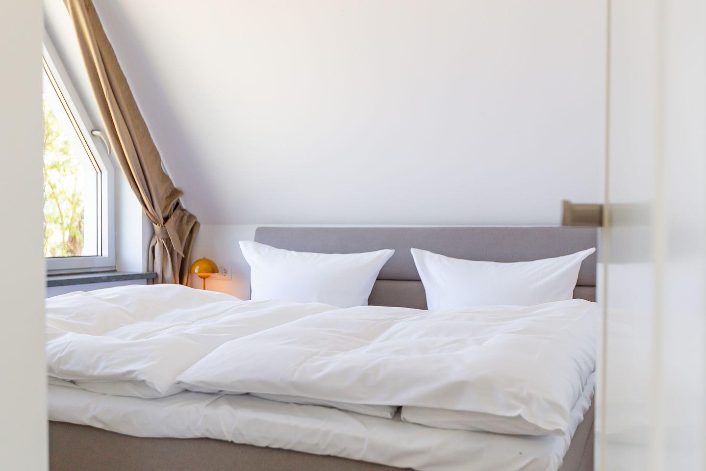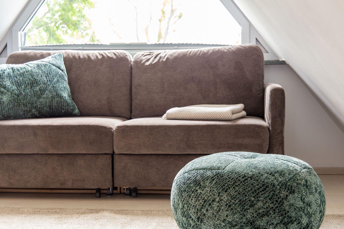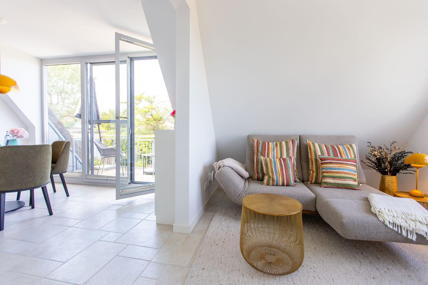 Über eine zusätzliche Treppe gelangst du in das Dachgeschoss. Mit dem Schlafsofa, den Sitzkissen und dem Tagesbett wurde hier ein weiterer Ort der Ruhe und des Rückzugs geschaffen. Der Raum lädt nicht nur als zweites Schlafzimmer ein, sondern auch sich zurückzulehnen, ein gutes Buch zu lesen oder die Lieblingsmusik beim Beobachten des Sonnenuntergangs zu genießen. Denn der Höhepunkt und somit zweifelslos ein atemberaubendes Urlaubserlebnis ist der spektakuläre Ausblick auf das Meer - aus (fast) jedem Raum!