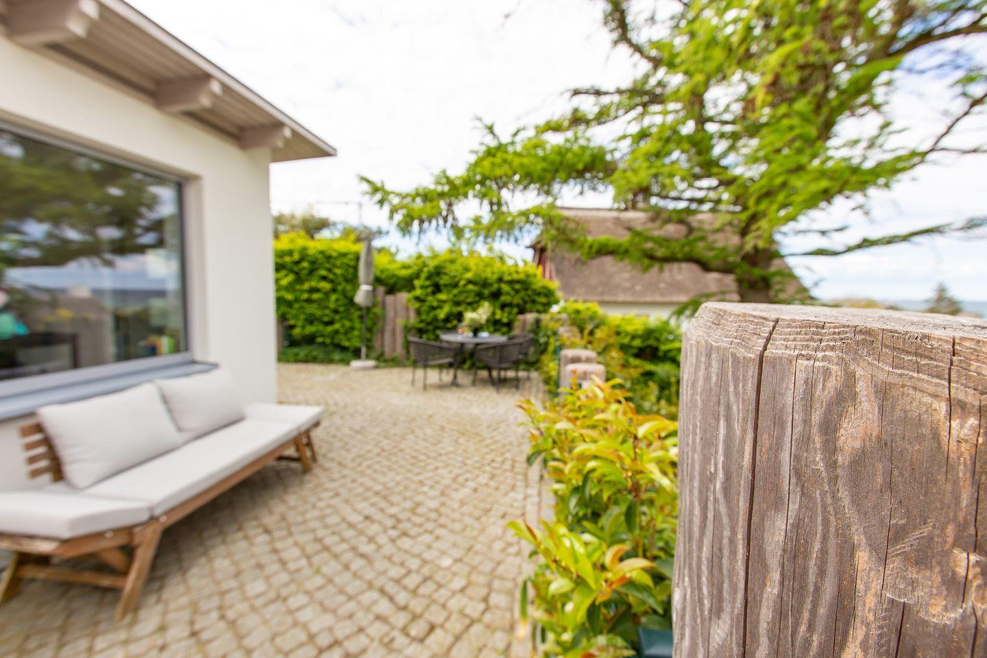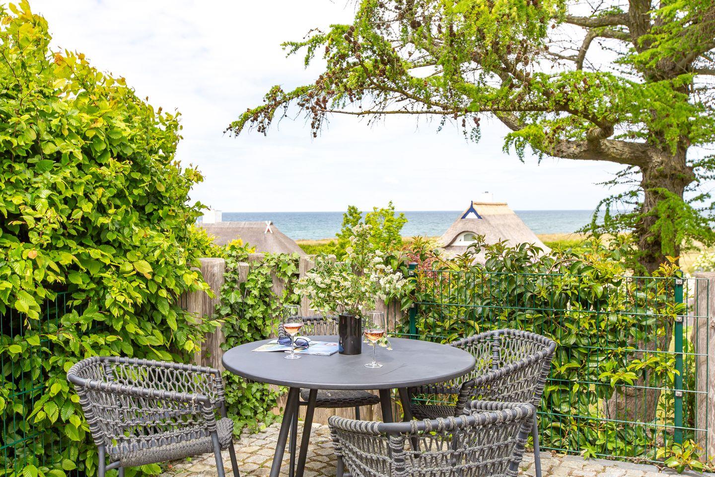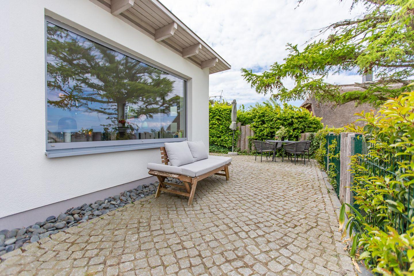 Ein echtes Highlight ist die großzügige, L-förmige Terrasse. Hier genießt du deinen ersten Kaffee mit Meeresrauschen und lässt den Tag bei traumhaften Sonnenuntergängen ausklingen. Ein kostenfreier PKW-Stellplatz gehört ebenfalls zum Ferienhaus.