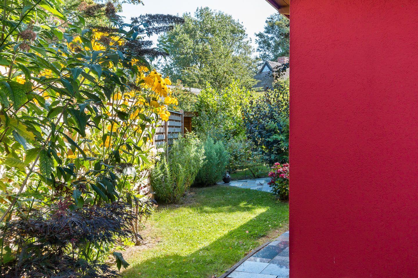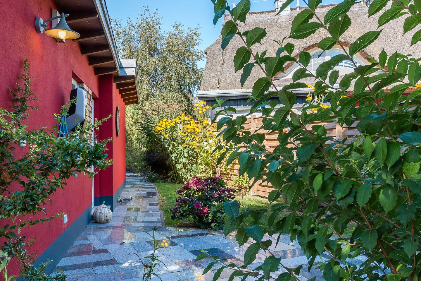 Im Außenbereich erwartet dich ein schön angelegter Garten mit viel Grün, heimischen Bepflanzungen und einer einladenden Terrasse. Hier kannst du die Seele baumeln lassen, während du dem Zwitschern der Vögel und dem sanften Rauschen der Blätter lauschst. Auch praktisch: Der PKW-Stellplatz befindet sich direkt neben dem Haus. Sogar eine Wallbox zum Laden eines E-Autos ist vorhanden. Hier erlebst du das Beste aus zwei Welten – Ruhe und Strandnähe kombiniert mit dem Komfort und Gemütlichkeit des Tiny Houses.
