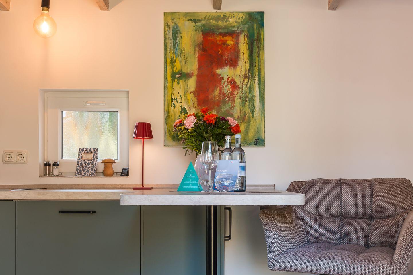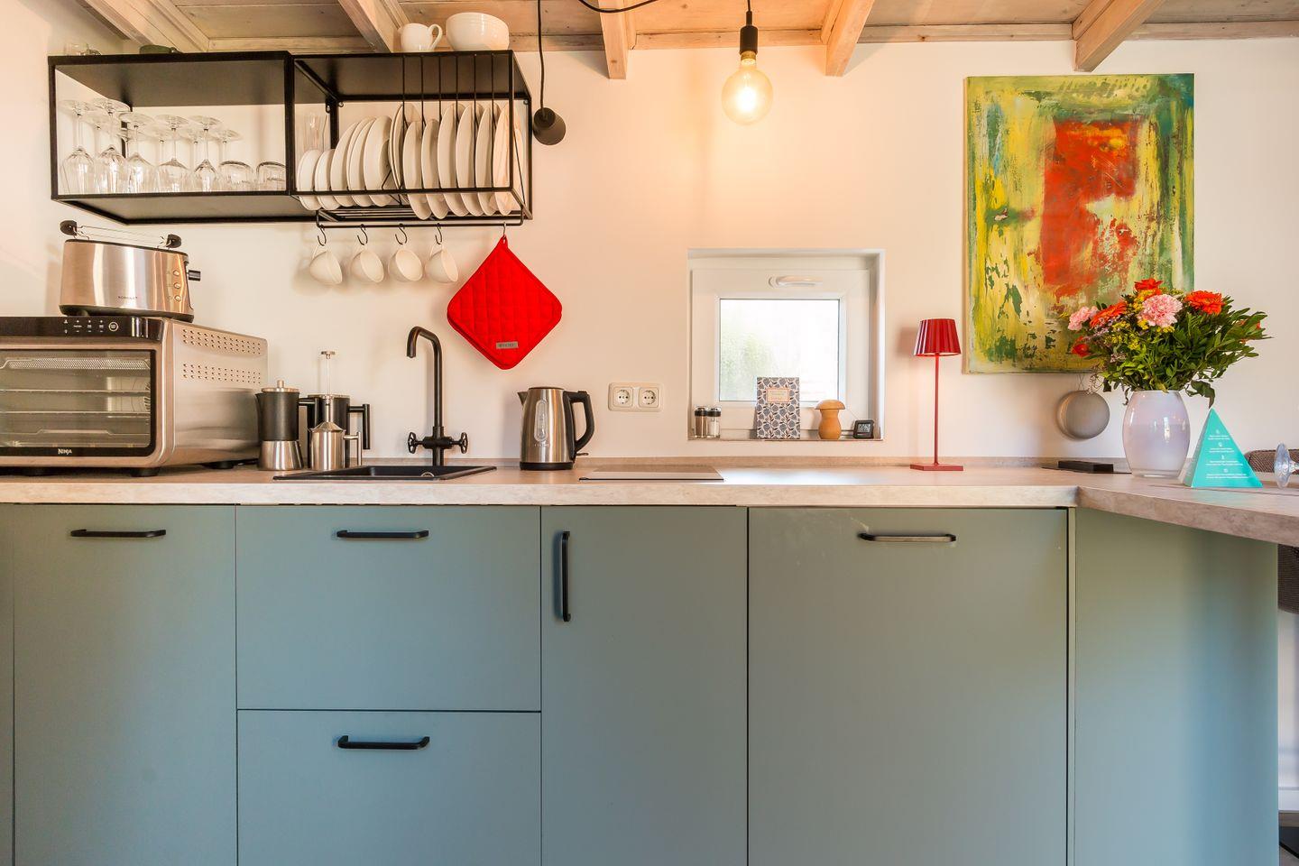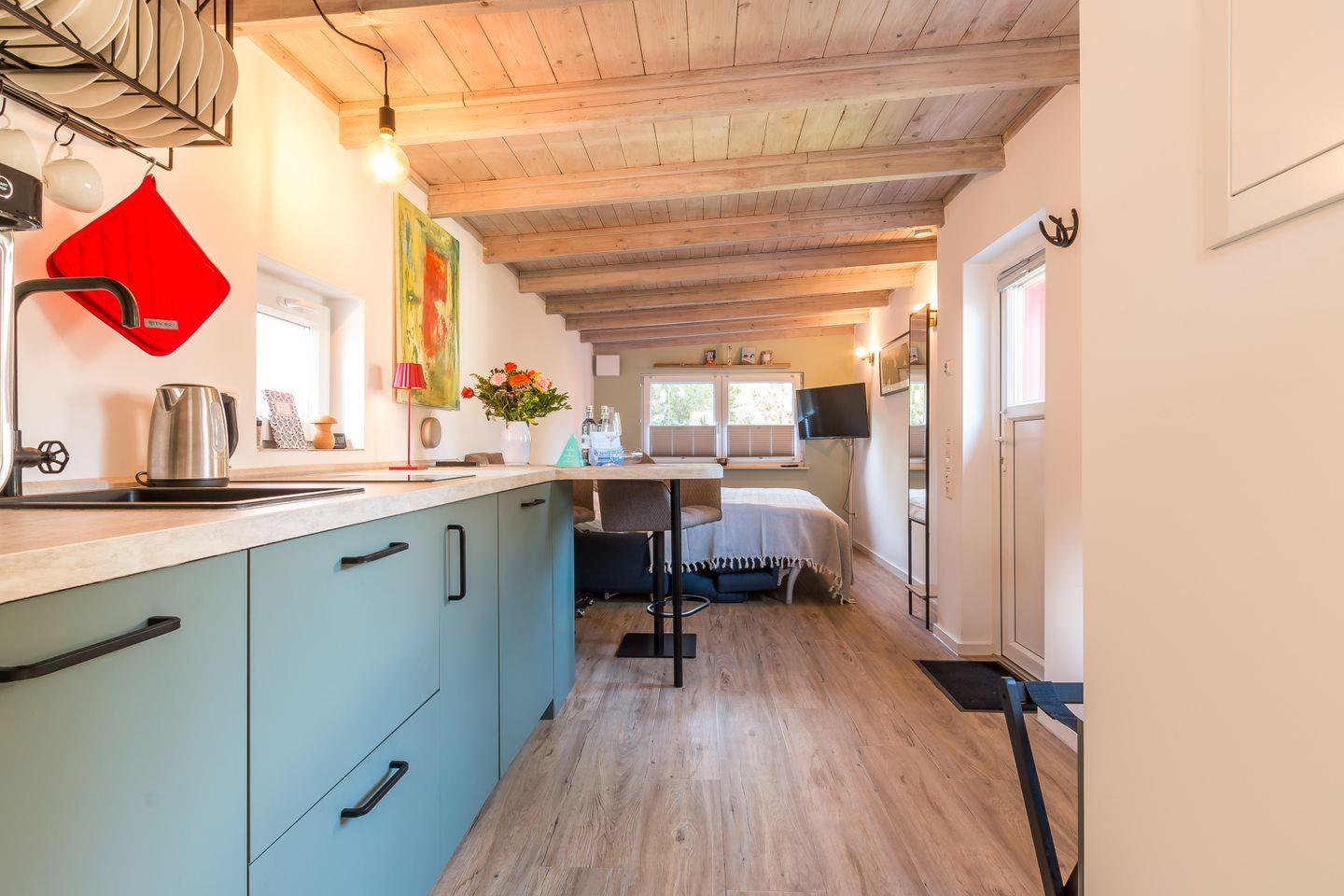 Willkommen in deinem Urlaub im Tiny House. Trotz seiner kleinen Größe erwartet dich hier ein durchdachter und intelligent gestalteter Innenraum. Jeder Quadratzentimeter ist optimal ausgenutzt und vermittelt dir ein Gefühl von Platz und Komfort. Der Wohn- und Schlafraum ist mit modernem Interieur ausgestattet, das auf harmonische Weise Funktionalität und Gemütlichkeit vereint. Stylisch kommt auch der Küchenbereich daher. Die schicke Anordnung der Küchenutensilien und der gemütliche Platz am Tresen machen das Kochen und Essen zum Vergnügen. Die Schlafcouch im Wohnbereich lädt tagsüber zum Entspannen ein und verwandelt sich für die Nacht in eine gemütliche Schlafgelegenheit. Separat befindet sich das Tageslichtbad mit Dusche und WC.