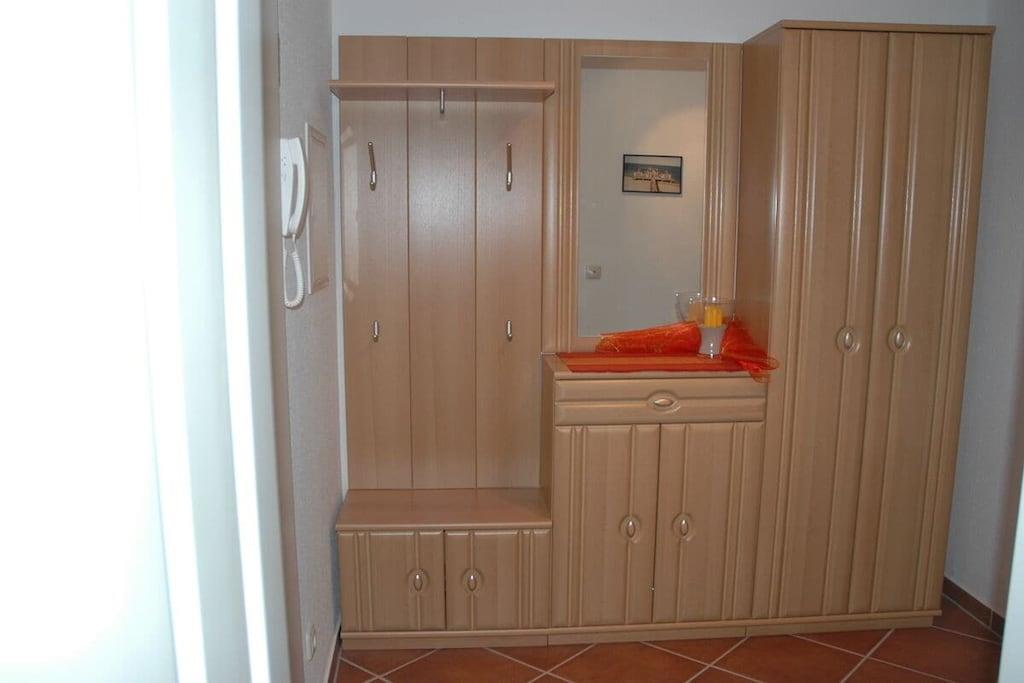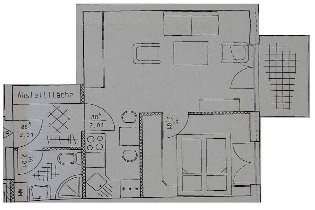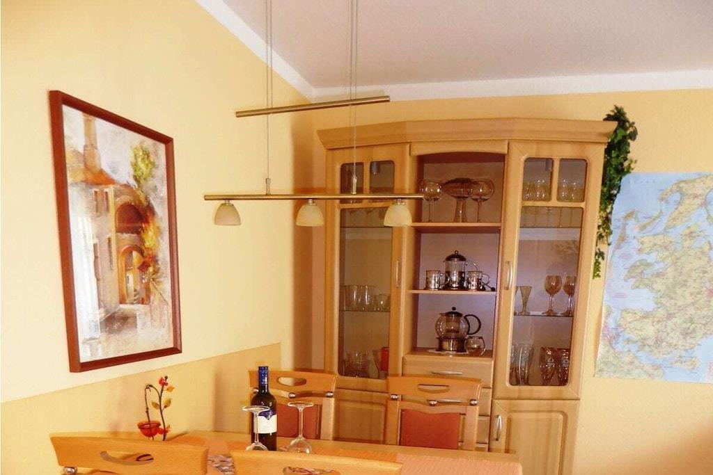 Die komfortabel eingerichtete 2-Zimmer-Ferienwohnung mit ca. 45 m² Wohn- u. Nutzfläche ist ideal für 2 Personen - Mehrbelegung auf Anfrage möglich . Sie erwartet ein gemütlichen Wohnraum mit Essbereich und separater Einbauküche, Schlafzimmer mit Doppelbett (190x160cm), WC mit Dusche und ein Vorflur mit Garderobe. Der Balkon liegt auf der Ostseite, d.h. sie können in Frühstück in der Morgensonne genießen. Schlafzimmer = Qualitätsbetten von Hülsta, Schwebetürenschrank. Wohn- u. Schlafzimmer sind mit elektrisch betriebenen Außenjalousien versehen.