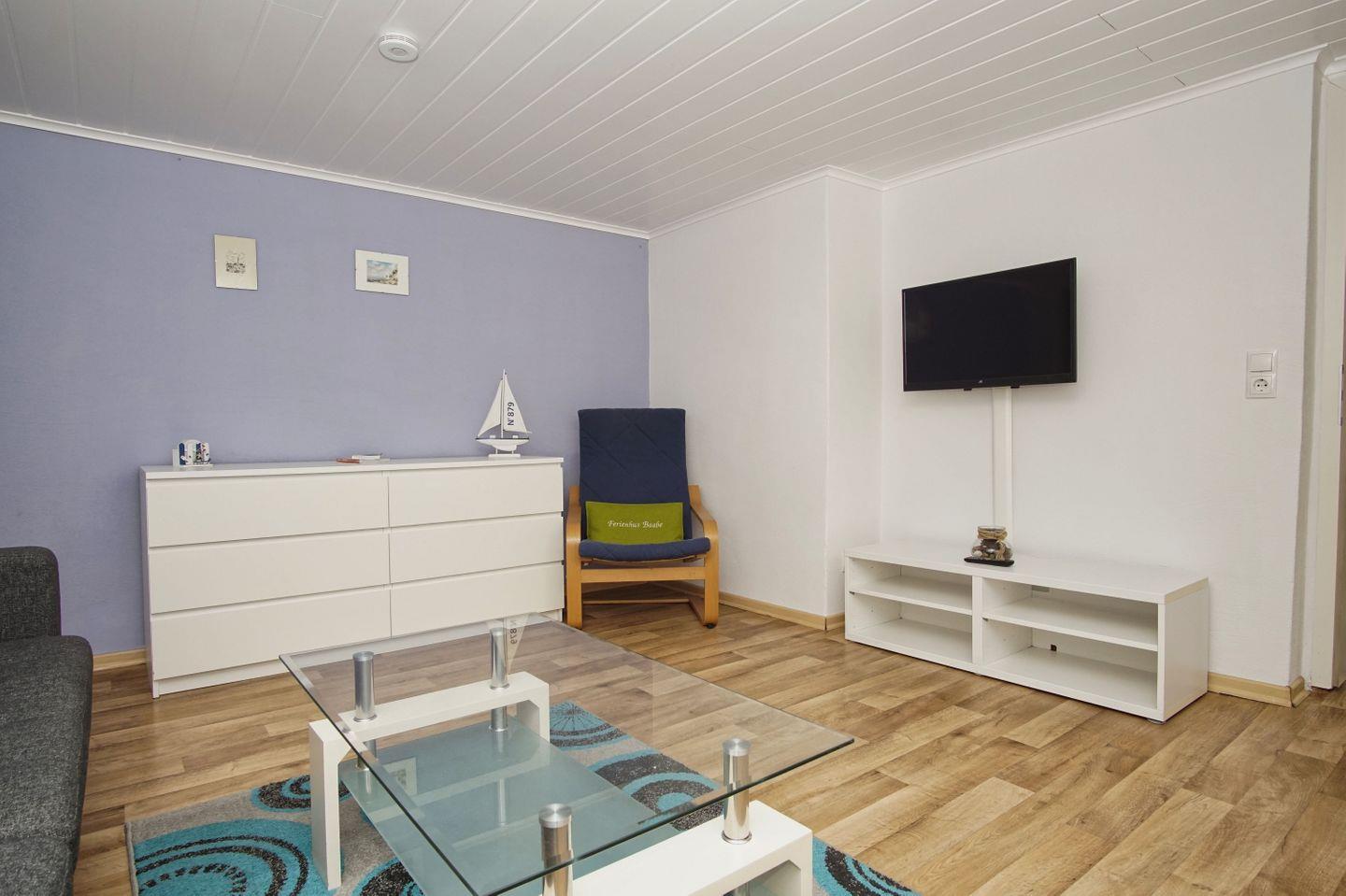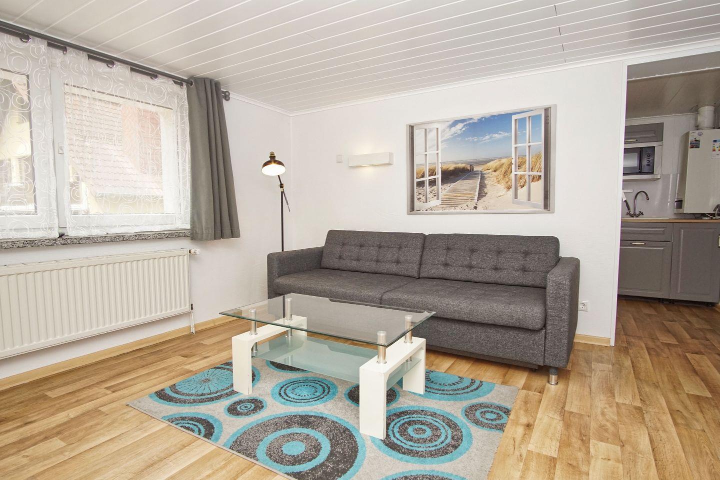 WOHNEN // Wohnraum mit bequemer Couch (Schlaffunktion), Schwingsessel, Flachbild-TV ++