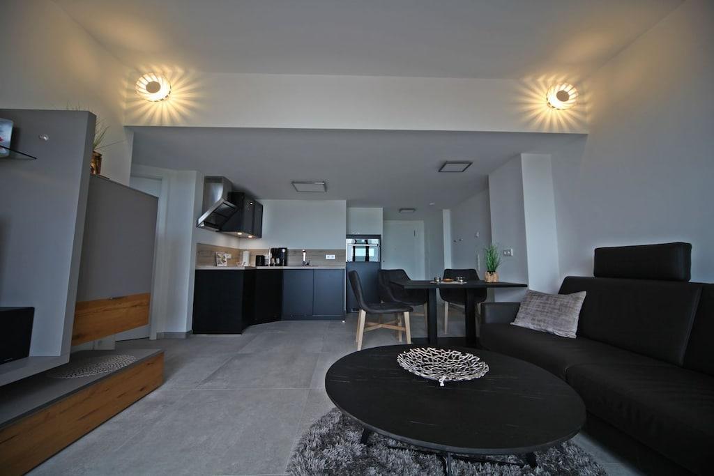2 Zi- Penthouse-Wohnung mit 16qm grosser Terraase und frontalem Meerblick auch aus der Wohnung, Whg. insges. 58qm, geeignet für 2(-4) Personen, 1 Schlafzimmer mit Doppelbett, 1 Messina-Schlafsofa (Dauerschläfer), hochwertig ausgestatteter Wohnbereich, breiterer Tiefgaragenplatz, im Kellergeschoss weitere Sauna und Relaxmöglichkeit, abschließbarer Kellerraum 4,5qm mit Steckdosen (z.B. für E-Bikes) Nichtraucherwohnung! Keine Haustiere in der Wohnung erlaubt!