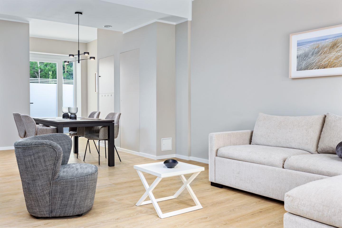 Modernes Ferienapartment in Prora mit Terrasse, nur 130 Meter vom Strand entfernt, ideal für erholsamen Ostseeurlaub.