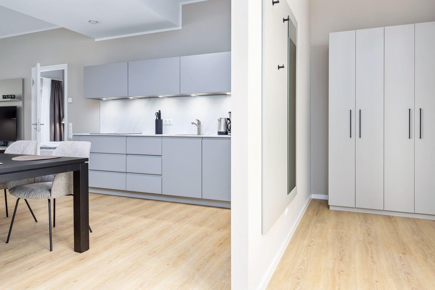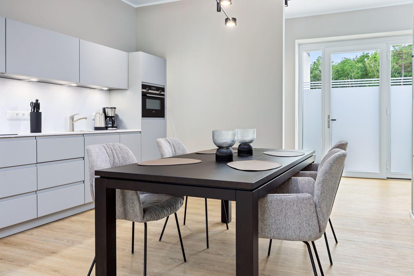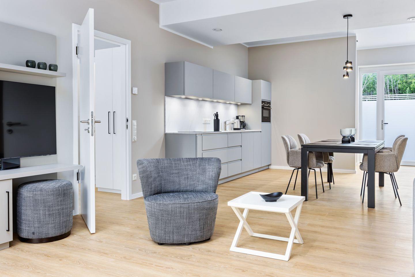 Das geschmackvoll eingerichtete Nichtraucher-Apartment verfügt über Fußbodenheizung, z.T. bodentiefe Fenster, kostenfreies WLAN und eine voll ausgestattete offene Küche mit Geschirrspüler, Kühlschrank mit Gefrierfach, Filterkaffeemaschine, Mixer, Toaster, Wasserkocher, Mikrowelle mit Backofenfunktion und 4-Felder Induktionsherd von BORA sowie über einen behaglichen und großzügigen Wohn-Essbereich. Im Wohnbereich befinden sich ein großer SMART-TV (55 Zoll) und eine Doppelschlafcouch (1,60 x 2,00 m).