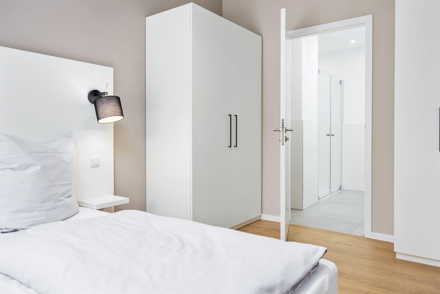 Das Schlafzimmer beinhaltet ein modernes Boxspring-Doppelbett (1,80 x 2,00 m), Kleiderschrank und einen eigenen SMART-TV (43 Zoll). Im stilvollen Badezimmer befinden sich Fußbodenheizung, Handtuchwärmer, eine ebenerdige Regendusche, WC, Waschtisch und Föhn.