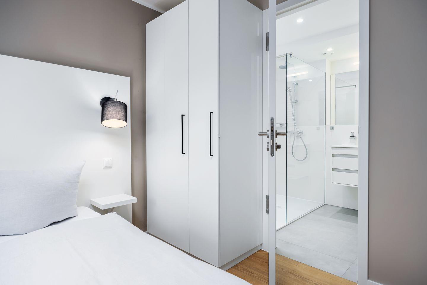 Zwei Schlafzimmer beinhalten jeweils ein modernes Boxspring-Doppelbett (1,80 x 2,00 m bzw. 1,60 x 2,00 m) und Kleiderschrank. Eines dieser Schlafzimmer verfügt des Weiteren über einen eigenen SMART-TV (43 Zoll) sowie über ein eigenes, direkt angeschlossenes Badezimmer. Im dritten Schlafzimmer befindet sich ein Etagenbett für zwei Personen (2 x 1,00 x 2,00 m), ein kleiner Schreibtisch und ein Kleiderschrank.