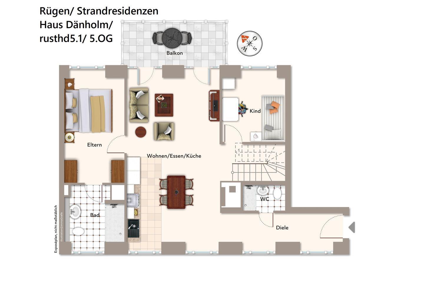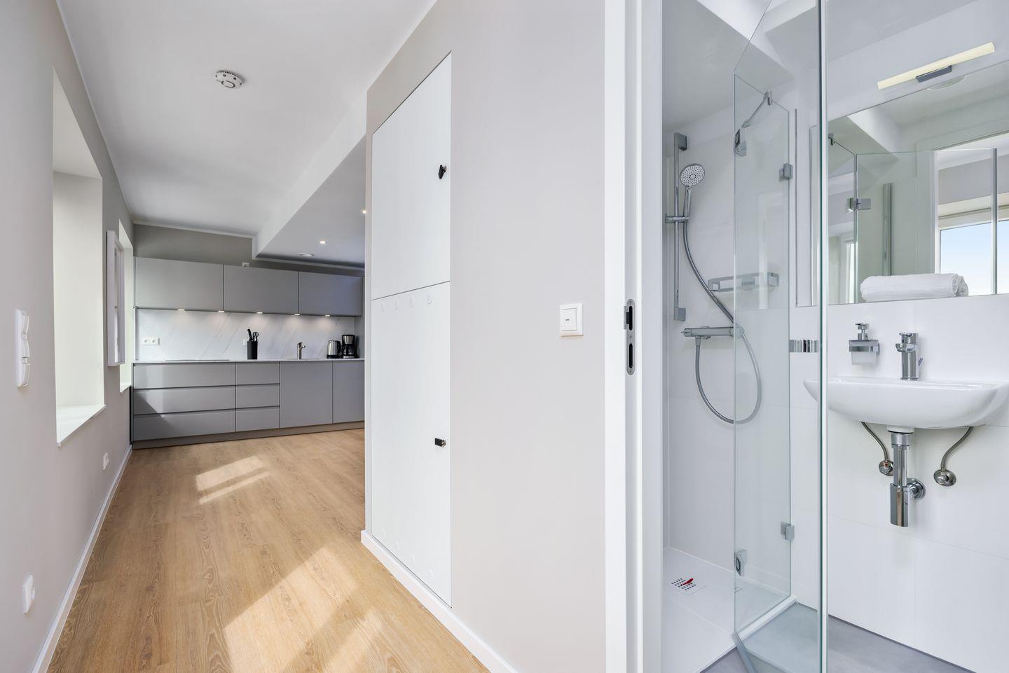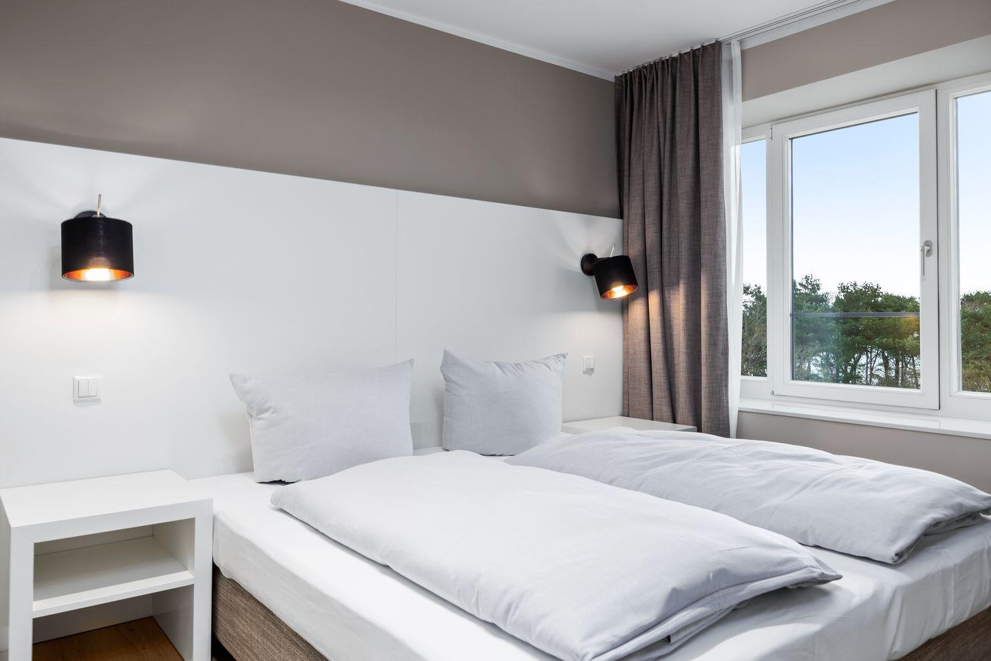 Das lichtdurchflutete Apartment befindet sich in nordöstlicher Lage in der fünften Etage und somit dem obersten Geschoss des Hauses Dänholm. Die Ostsee liegt euch hier zu Füßen - in nur 130 Metern erreicht ihr den feinsandigen, kilometerlangen Südstrand. In der Umgebung warten zahlreiche Ausflugsmöglichkeiten auf euren Besuch: Das Dokumentationszentrum Prora, das Prora-Zentrum, das Oldtimer-Museum Rügen, das NVA-Museum Rügen, die Galileo Wissenswelt Rügen, der Kletterwald Binz-Prora und das Naturerbe Zentrum Rügen mit dem Baumwipfel-Pfad sowie das beliebte Karls Erlebnis-Dorf in Zirkow. Fußläufig befinden sich zwei Bäckereien, einige Bistros sowie ein Restaurant, kleine Mode- und Souvenirgeschäfte als auch ein Fahrradverleih. Eine Segelschule befindet sich in ca. 3 km Entfernung. Im nahe gelegenen Dormero Strandhotel (ca. 800 m) könnt ihr Tagestickets erwerben und den Pool, die Sauna und den Fitnessbereich nach Herzenslust genießen.