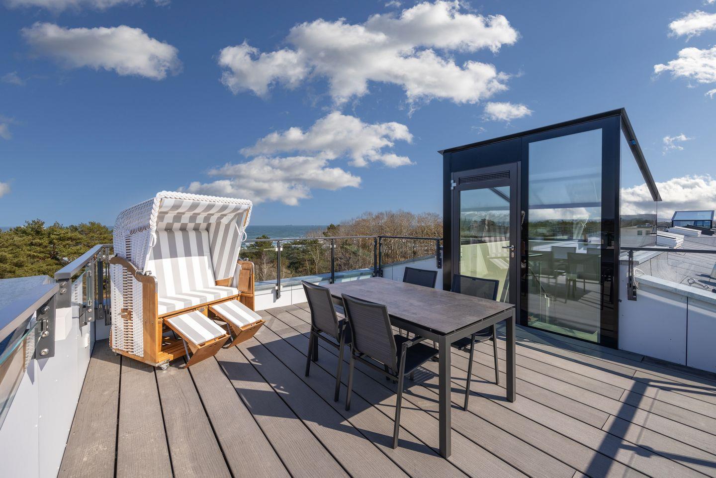 Ein Highlight des Apartments ist die Dachterrasse mit Strandkorb und Blick auf die Ostsee und den Strand. Genießt das milde Klima der Insel in ganz privater Atmosphäre und verbringt erholsame Stunden.