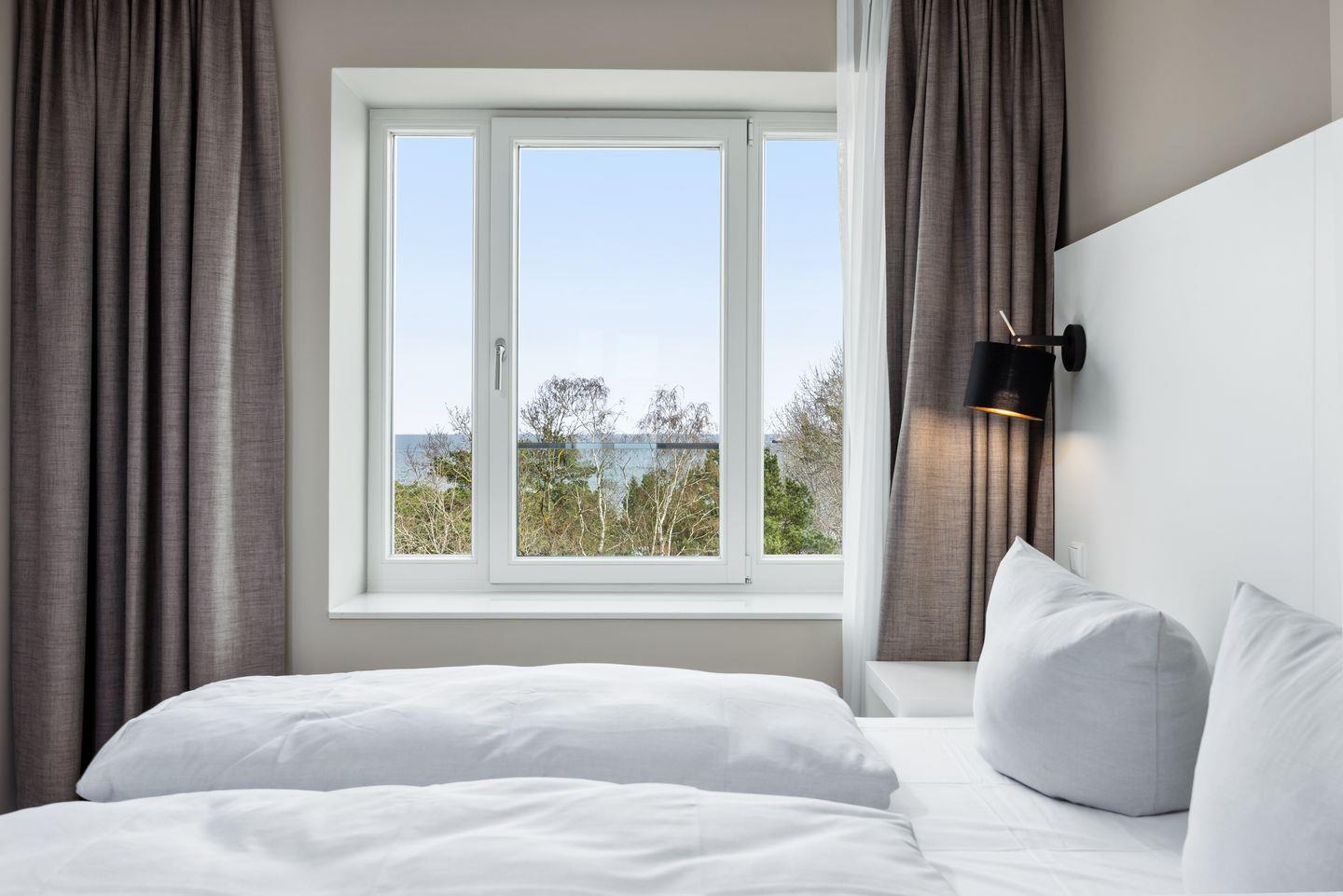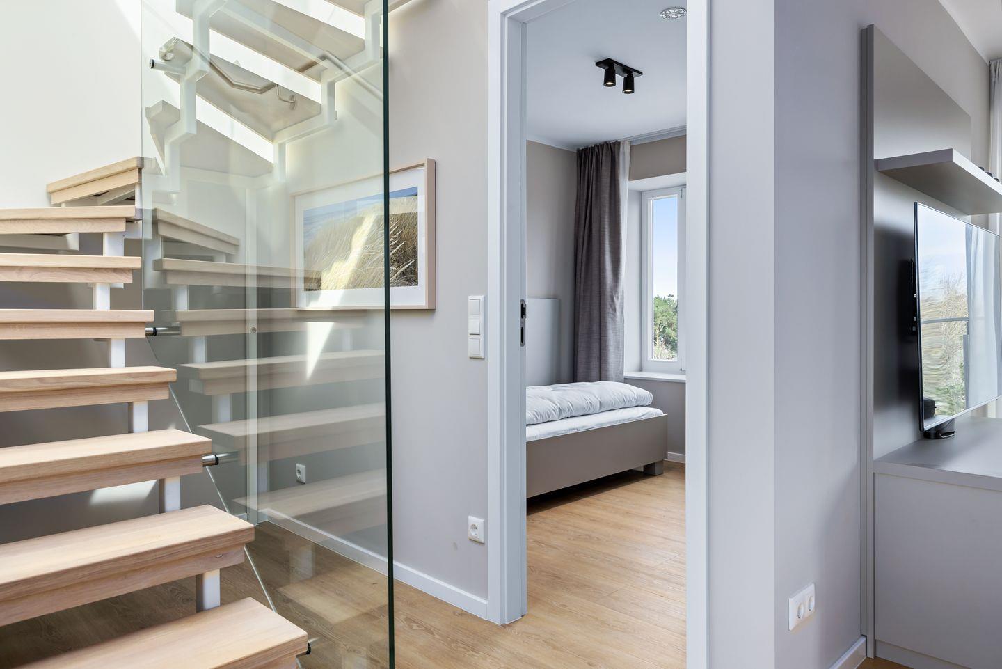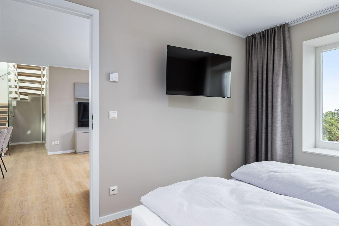 Das größere der beiden Schlafzimmer bietet besonders hohen Komfort durch ein eigenes und nur über das Schlafzimmer zugängliches Badezimmer, ein modernes Boxspring-Doppelbett (1,80 x 2,00 m), einen Kleiderschrank und einen eigenen SMART-TV (43 Zoll). Im kleineren Schlafzimmer befindet sich ein komfortables Boxspring-Einzelbett (0,90 x 2,00 m) und ein kleiner Schreibtisch sowie ein Kleiderschrank.
