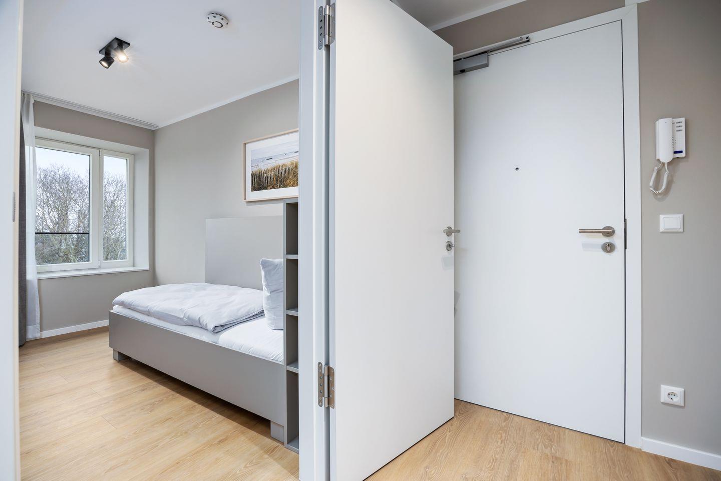 In diesem Apartment ist ein hohes Maß an Privatsphäre gewährleistet; es stehen euch drei separate Schlafzimmer zur Verfügung. Das größte der drei Schlafzimmer bietet dabei einen besonders hohen Komfort durch ein eigenes Badezimmer, ein modernes Boxspring-Doppelbett (1,80 x 2,00 m), Kleiderschrank und einen eigenen SMART-TV (43 Zoll). In den weiteren Schlafzimmern befinden sich ein komfortables Boxspring-Doppelbett (1,80 x 2,00 m) und ein Kleiderschrank bzw. ein Boxspring-Einzelbett (0,90 x 2,00 m) und ein kleiner Schreibtisch sowie ebenfalls ein Kleiderschrank.