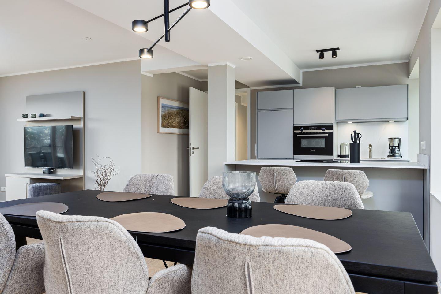 Das geschmackvoll eingerichtete Nichtraucher-Apartment verfügt über Fußbodenheizung, z.T. bodentiefe Fenster, kostenfreies WLAN und eine voll ausgestattete offene Küche mit Geschirrspüler, Kühlschrank mit Gefrierfach, Filterkaffeemaschine, Mixer, Toaster, Wasserkocher, Mikrowelle mit Backofenfunktion und 4-Felder Induktionsherd von BORA sowie über einen behaglichen und großzügigen Wohn-Essbereich. Im Wohnbereich befindet sich ein großer SMART-TV (55 Zoll).