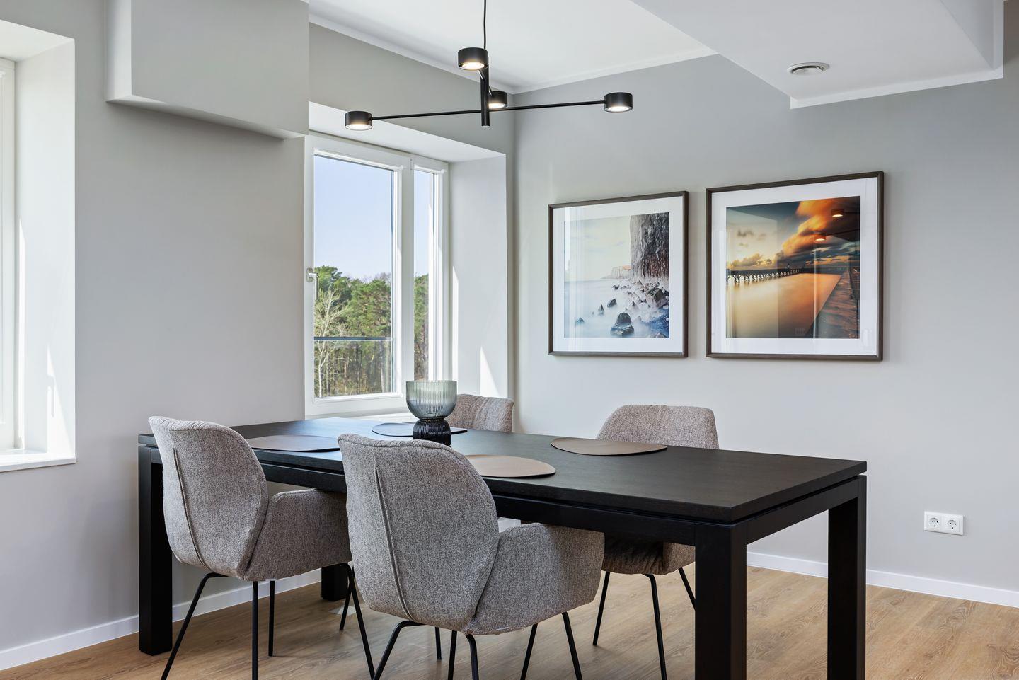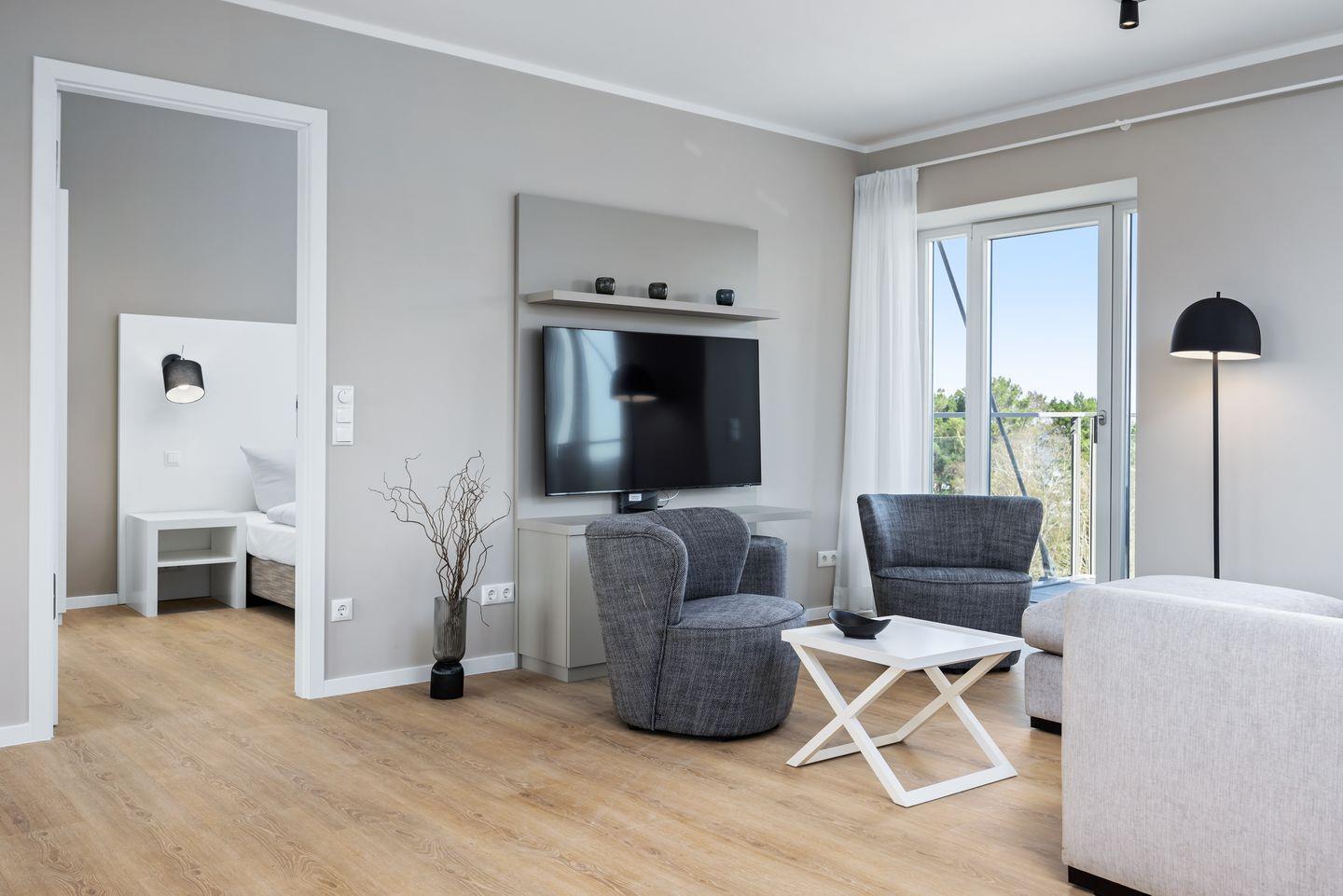 Das geschmackvoll eingerichtete Nichtraucher-Apartment verfügt über Fußbodenheizung, z.T. bodentiefe Fenster, kostenfreies WLAN und eine voll ausgestattete offene Küche mit Geschirrspüler, Kühlschrank mit Gefrierfach, Filterkaffeemaschine, Mixer, Toaster, Wasserkocher, Mikrowelle mit Backofenfunktion und 4-Felder Induktionsherd von BORA sowie über einen behaglichen und großzügigen Wohn-Essbereich. Im Wohnbereich befindet sich ein großer SMART-TV (55 Zoll).