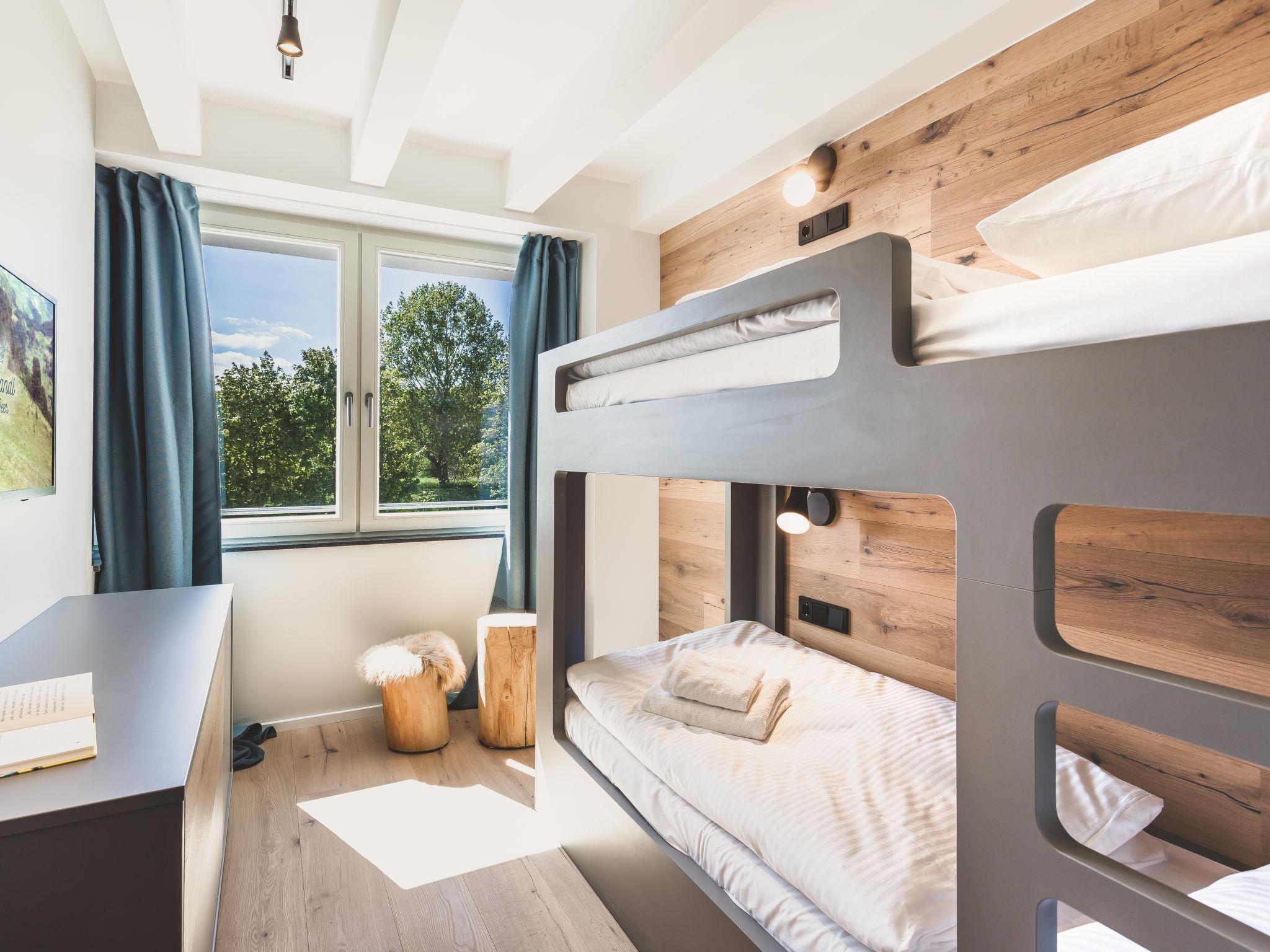 "Seealm XXL", 4-Zimmer-Wohnung 110 m2. Objekt geeignet für 4 Erwachsene + 2 Kinder. Geräumig, komfortabel und modern eingerichtet: Wohn-/Esszimmer mit Sat-TV (Flachbildschirm). Ausgang zum Balkon. 2 Zimmer, jedes Zimmer mit 1 Doppelbett und Dusche/WC. 1 Zimmer mit 1 x 2 Etagenbetten. Kochnische (Backofen, Geschirrspüler, 4 Glaskeramikplatten, Toaster, Wasserkocher, Mikrowelle, elektrische Kaffeemaschine, Kapseln für die Kaffeemaschine (Nespresso) extra). Dusche/WC. Parkettboden. Balkon. Balkonmöbel. Zur Verfügung: Sauna, Babybett bis 2 Jahre. Internet (Wireless LAN, gratis). Bitte beachten: Nichtraucher-Unterkunft. Maximal 1 Haustier/Hund erlaubt. Rauchmelder.