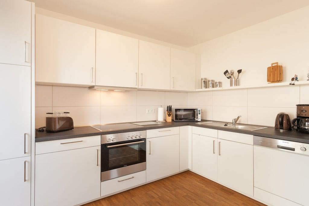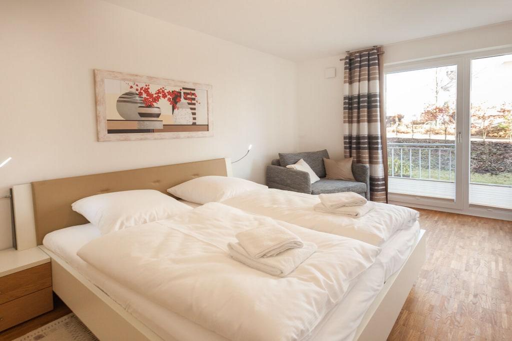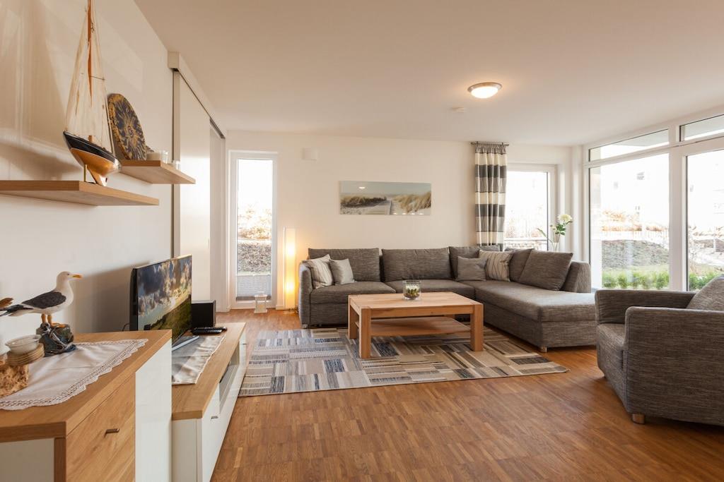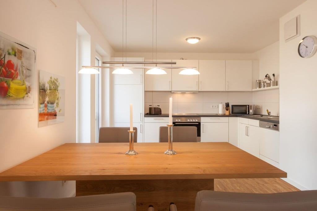 Ein Ferienobjekt in gehobener Ausstattung, modern, mit großen Fensterflächen und somit lichtdurchfluteten Räumen, offenem Grundriss, Terrasse, Fußbodenheizung, Echtholzparkett, barrierefrei, Lift von der Tiefgarage zur Wohnung und hochwertige Möbelausstattung in der Wohnung, style und geschmackvoll. Die Einbauküche ist mit Markengeräten, Elektroherd, Geschirrspüler, Mikrowelle, Kaffeemaschine, Toaster, ... ausgestattet. Und sollten Sie einmal keine Lust haben mehr in der Küche zu stehen, nur 30m entfernt ist eine Bäcker- und Konditorei mit wunderbarer Frühstücksauswahl. Für die Unterhaltung steht eine HiFi-Anlage und ein Flachbild-TV zur Verfügung. WLAN ist auch vorh. und kostenlos. Die Ferienwohnung ist ebenerdig, barrierefrei und seniorengerecht, aber auch bestens geeignet für 2 Erw. mit 2 Kindern.