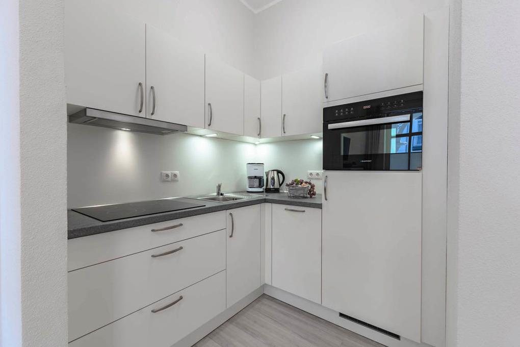 Halboffene, hochwertige Küche, voll ausgestattet u. a. mit Spülmaschine, Kühlschrank mit Gefrierfach, Backofen mit integrierter Mikrowelle, Cerankochfeld mit TouchControl Bedienung, Kaffeemaschine, Wasserkocher, Toaster.