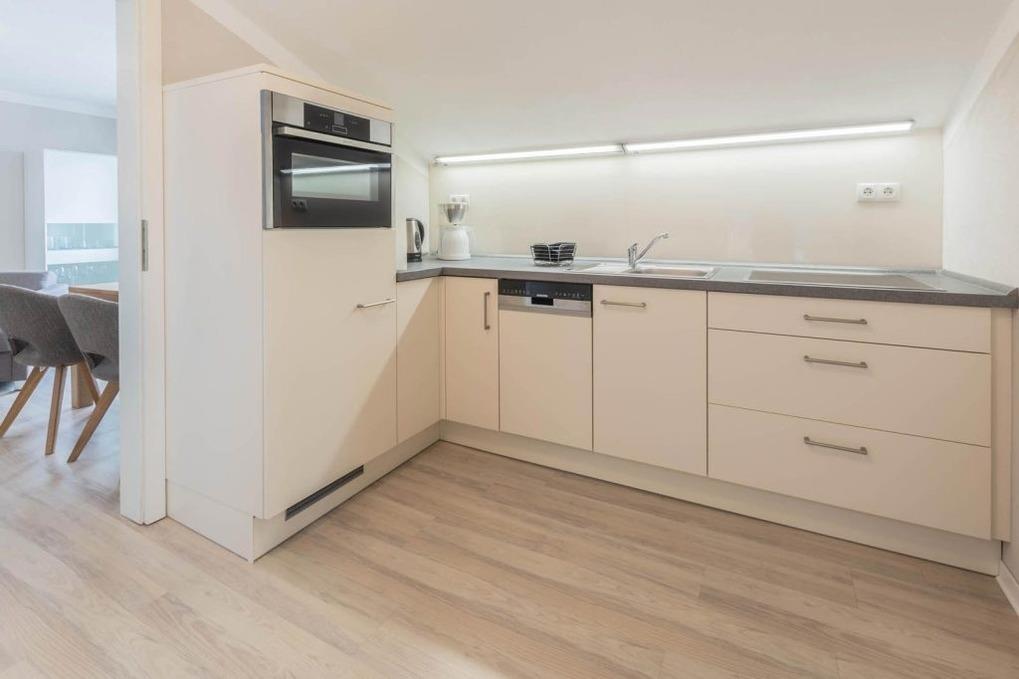 Separate, hochwertige Küche (Dachschräge, ohne Fenster), voll ausgestattet u. a. mit Spülmaschine, Kühlschrank mit Gefrierfach, Glaskochfeld mit Touchcontrol-Bedienung, Backofen mit integrierter Mikrowelle, Kaffeemaschine, Wasserkocher und Toaster.
