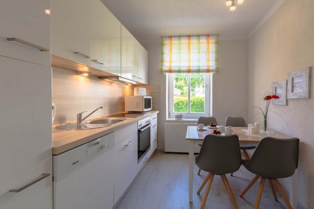 Separate Küche, voll ausgestattet u. a. mit Spülmaschine, Kühlschrank mit großem Gefrierteil, Cerankochfeld und Backofen, Mikrowelle, Kaffeemaschine, Wasserkocher und Toaster. Esstisch mit 4 Stühlen.