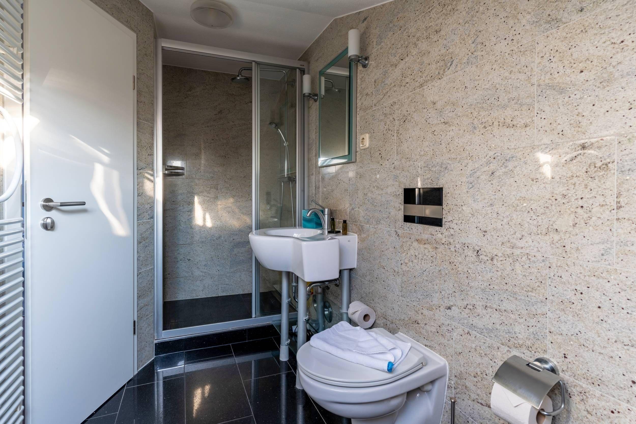 Im Badezimmer befindet sich neben Waschbecken und Toilette eine Dusche.