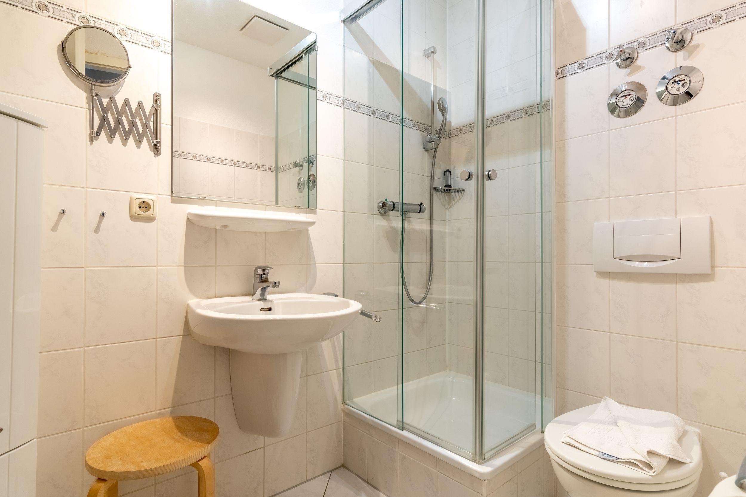 Das helle Bad lädt beim Frisch machen außerdem zum Entspannen und wohl fühlen ein.