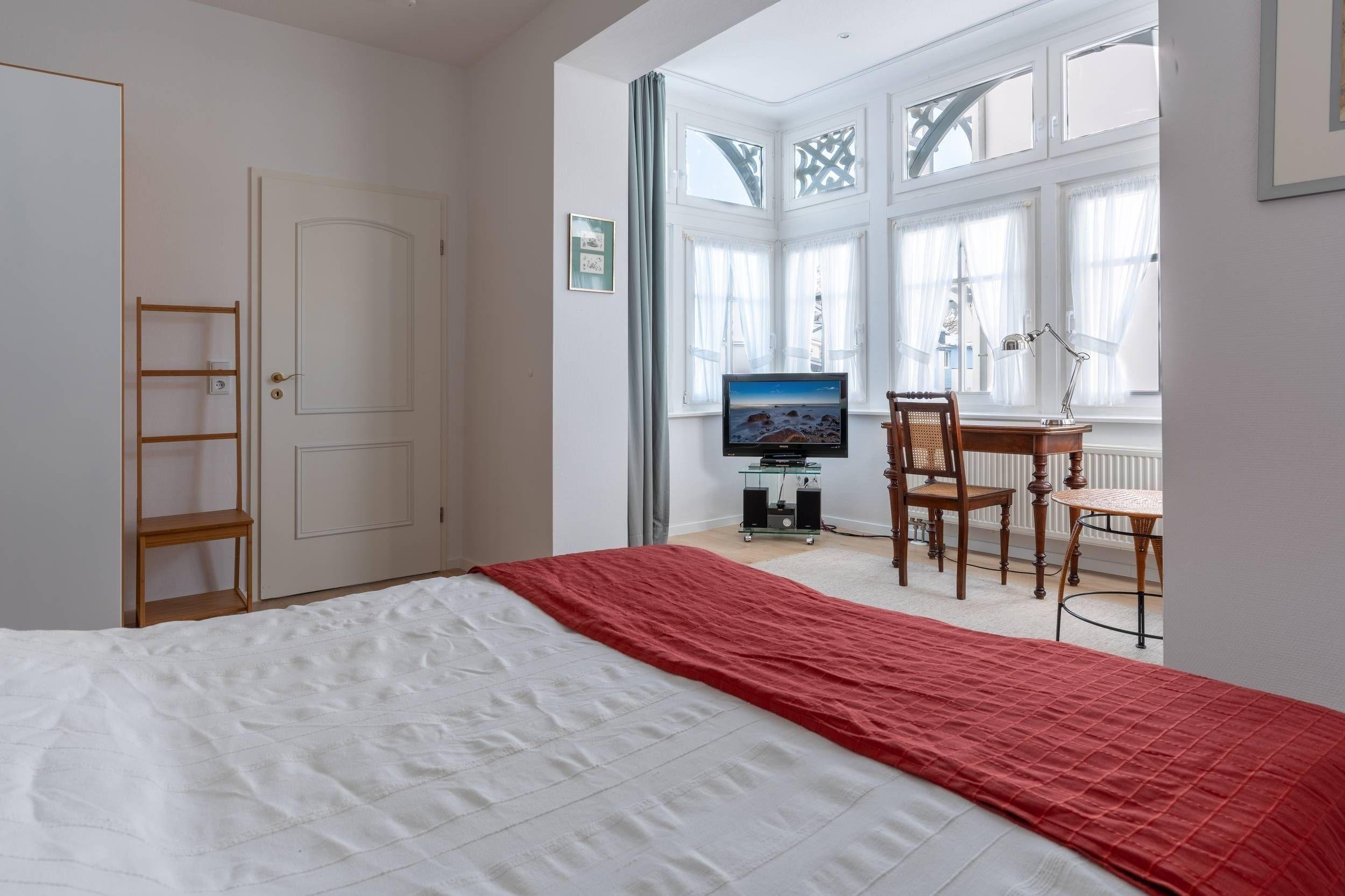 Im Schlafzimmer befindet sich ein Doppelbett, ein Kleiderschrank und ein kleiner Arbeitsplatz sowie ein zusätzliches Fernsehgerät.