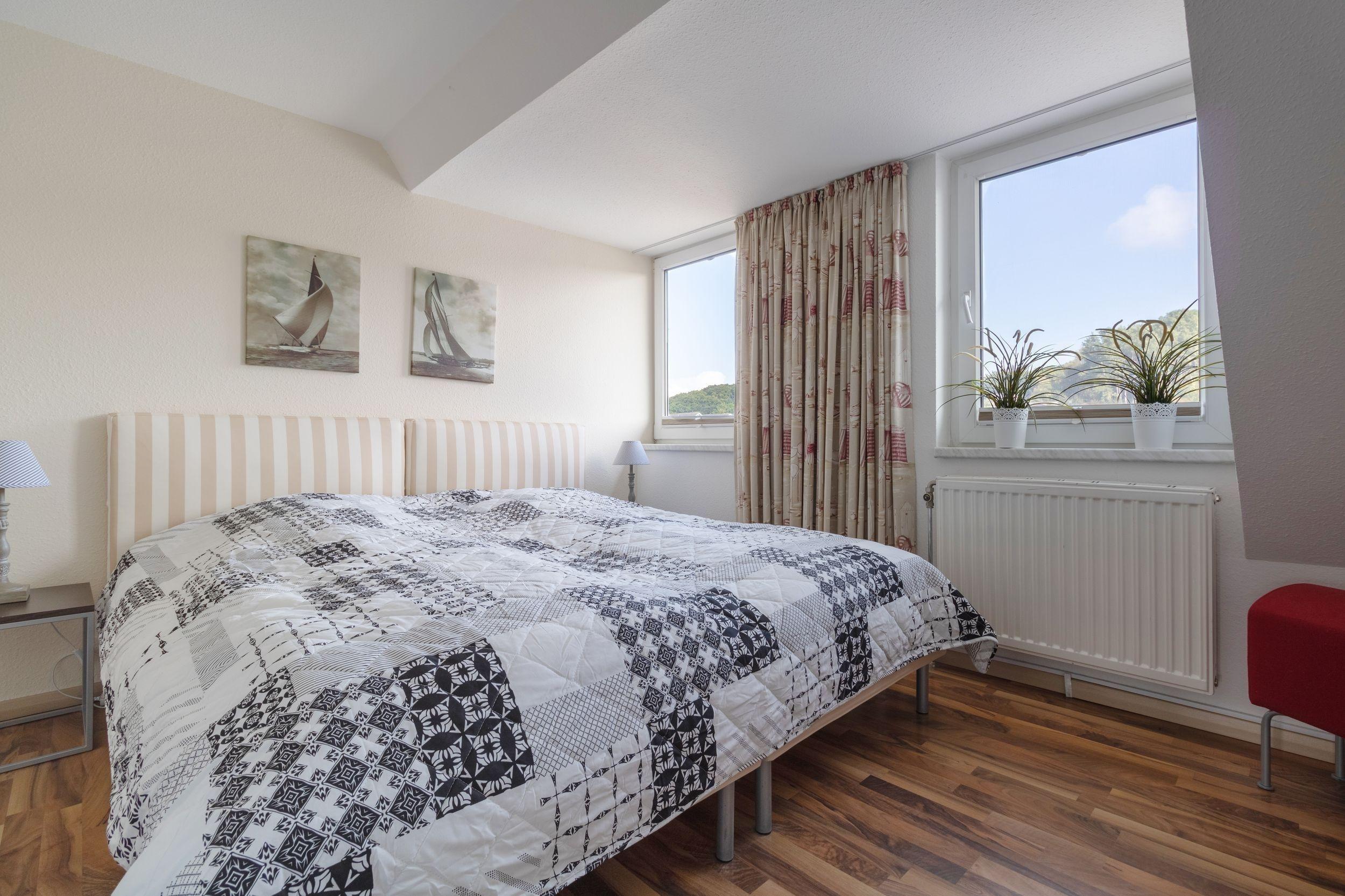 In dem ersten Schlafzimmer befindet sich ein 1,80 m breites Doppelbett, ein Kleiderschrank sowie ein Fernsehgerät. Das zweite Schlafzimmer bietet 2 Einzelbetten und einen Kleiderschrank. Auf der funktionalen Couch im Wohnzimmer finden zwei weitere Personen einen Schlafplatz. Dort befindet sich außerdem ein weiteres Fernsehgerät.